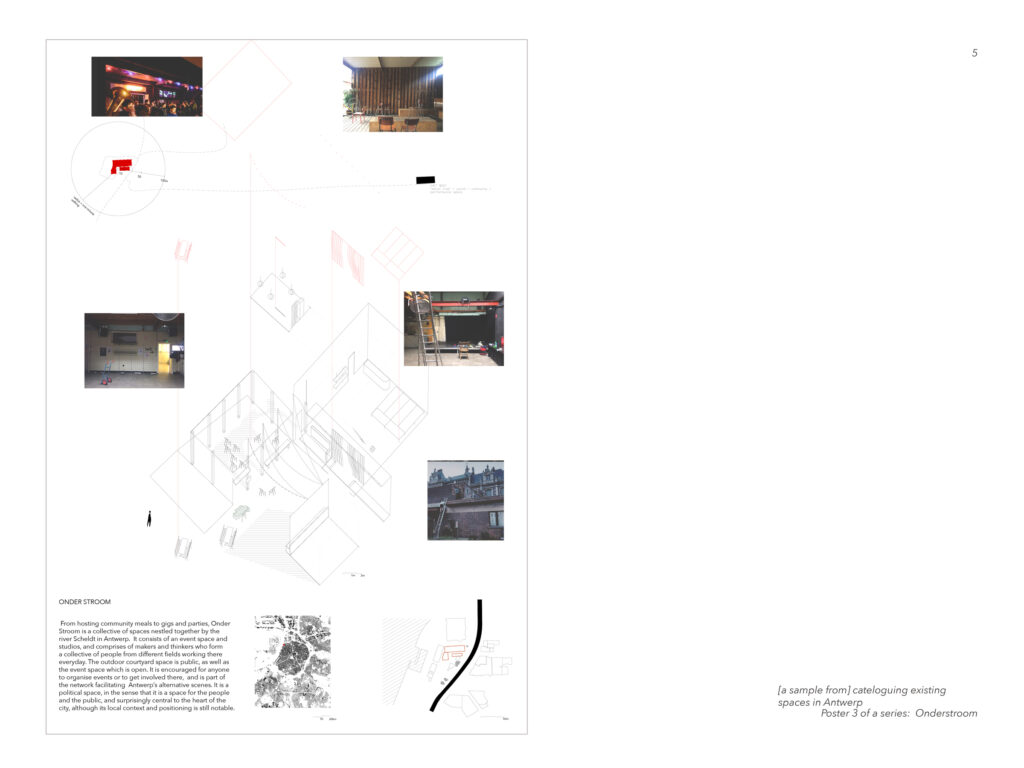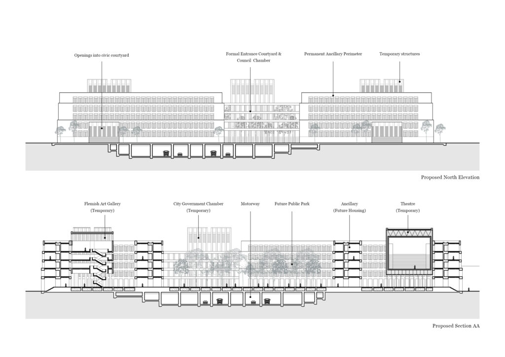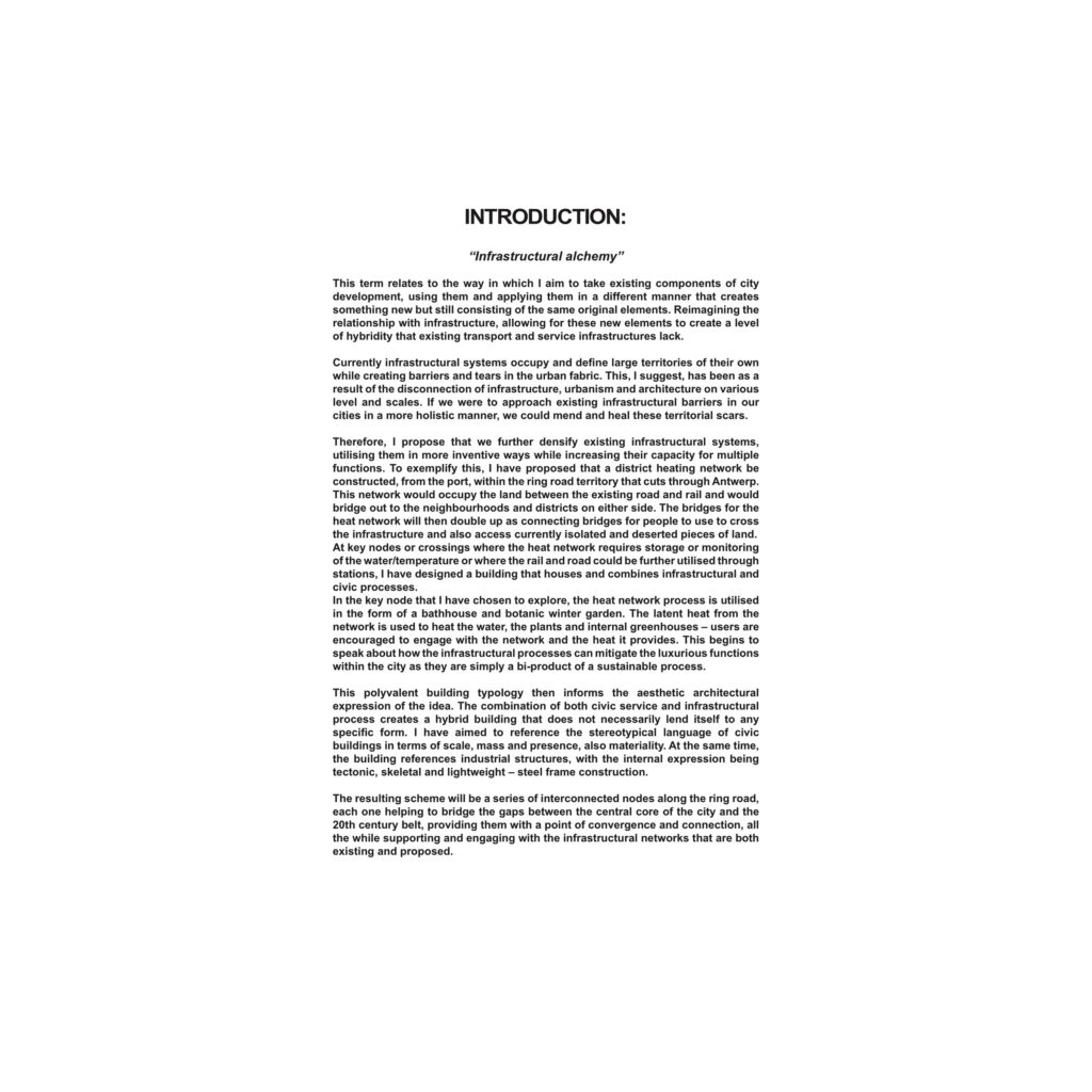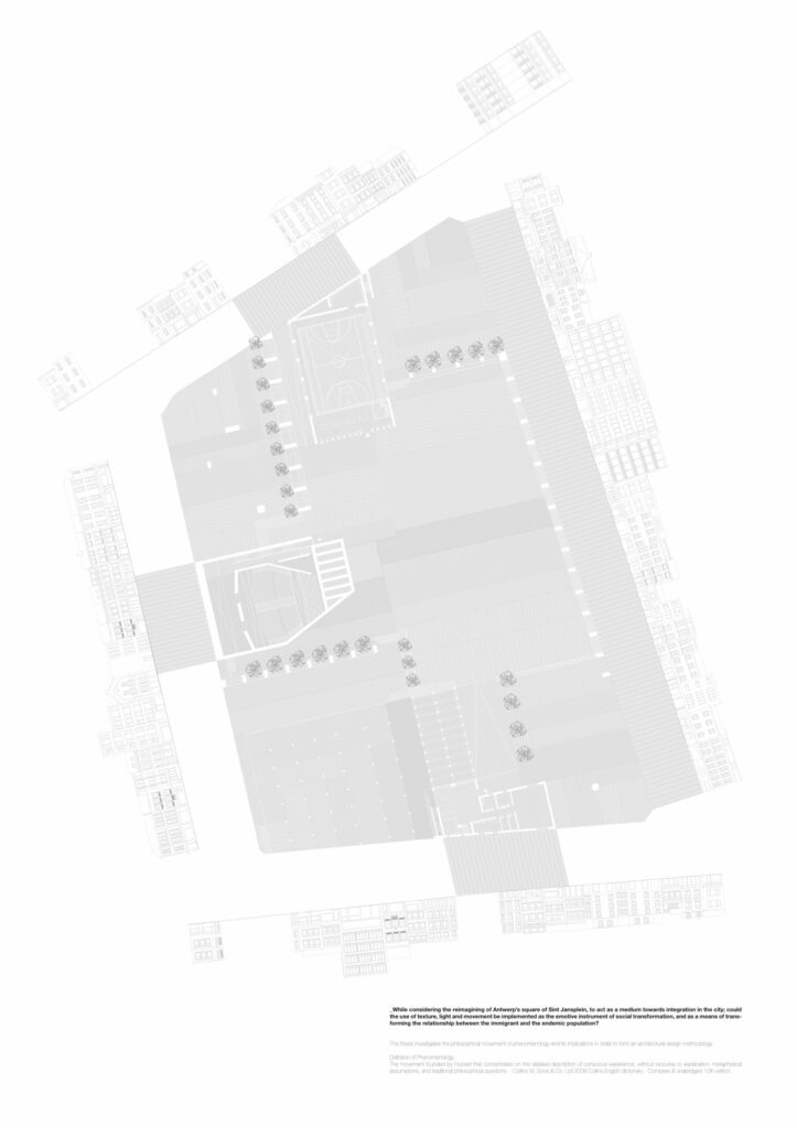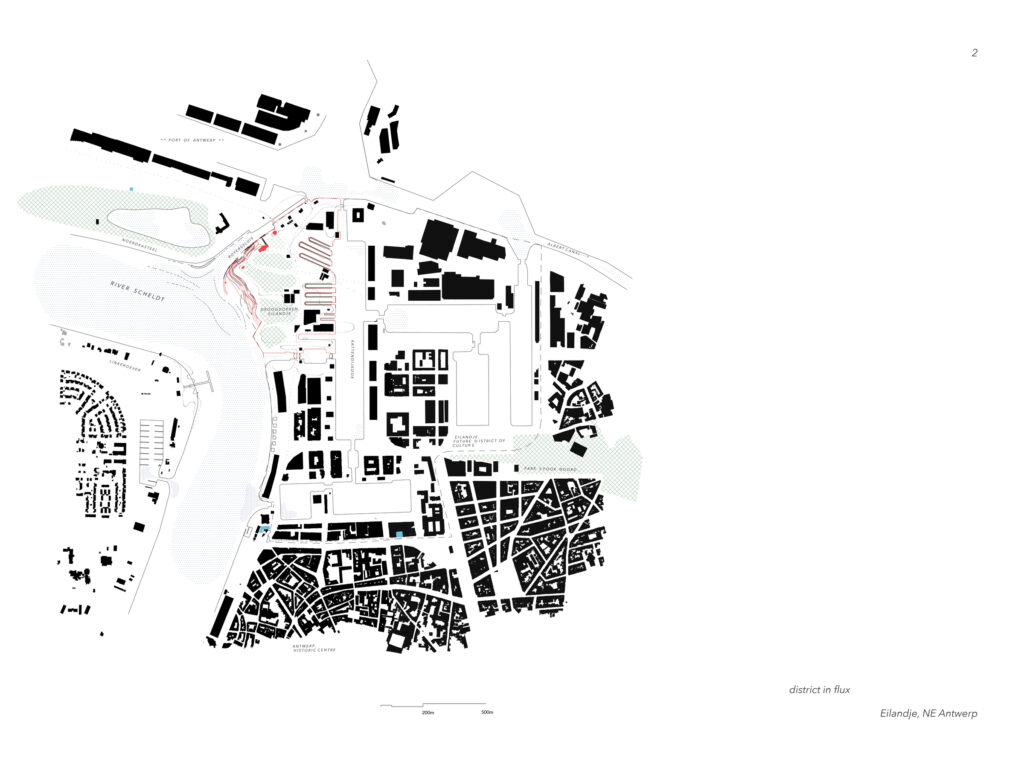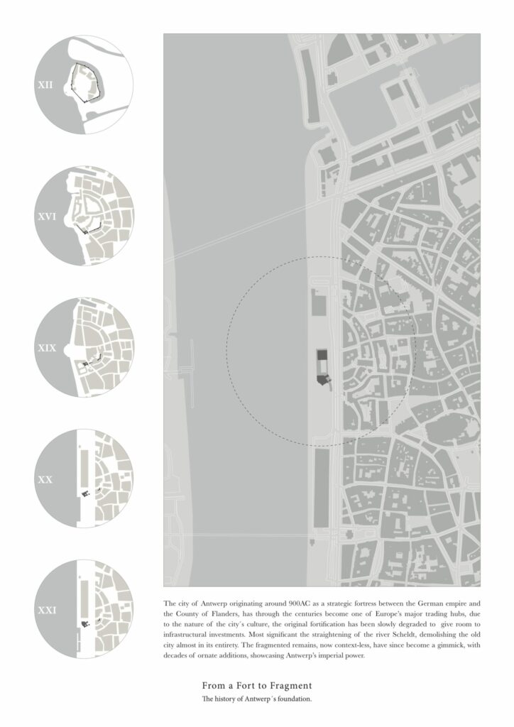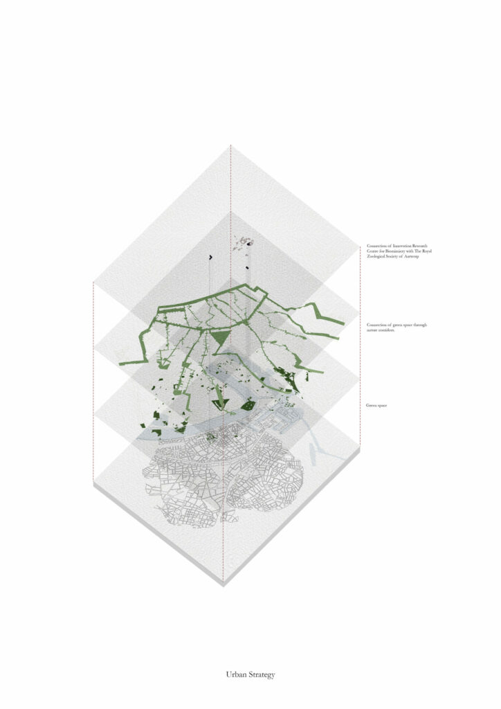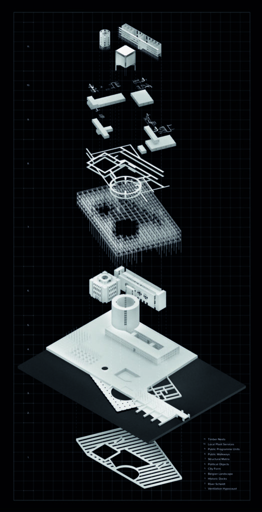 ‘Scaffolding the City’ is a project which inhabits underutilized land across Antwerp. The spaces are filled with an unorthodox architectural language which speaks of informality, community engagement and adaptability. As an inhabitable scaffolding form, the proposal takes on a series of incisions into the urban landscape where normality is fragmented and boundaries, physically and politically, can be breached. The scaffolding incisions will inhabit gap sites across the city for the duration that the site is vacant or until thegrowth of a permanent sub-district community infrastructure. In its lifespan the structure will facilitate a socially stimulating landscape for the sub-districts of Antwerp City. The programme for this is based on key strategies which encourage the growth of a politically and culturally stimulated programme: Exchange, Peoples Forum, Knowledge, Cultivate and Play.