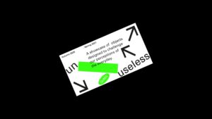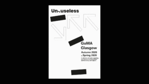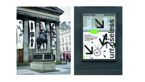This identity system is for use in a fictional exhibition showcasing objects from various designers and artists that subvert the utilitarian uses and social relevance of everyday objects. Following from the vinyl signage experiments, promotional elements for the exhibition as well as a logo was developed. The exhibition title is inspired from an interview with original Chindogu artist Kenji Kawakami in which he describes his inventions as 'un-useless'. The sound as well as the grammatical formation of the word is an ideal indicator for the absurdity of these inventions and encapsulates the retaliation of conformity found in the objects included in the exhibition. A continued sense of fun and irony is included in the brand as the wonky dash and signage icons becomes characters in themselves, subverting the order and use of posters and banners. Even the printed material becomes objects of interference. A leaflet too big to handle and a poster that spreads its message through tear away stubs that ultimately lead to its demise integrates the brand irony further.