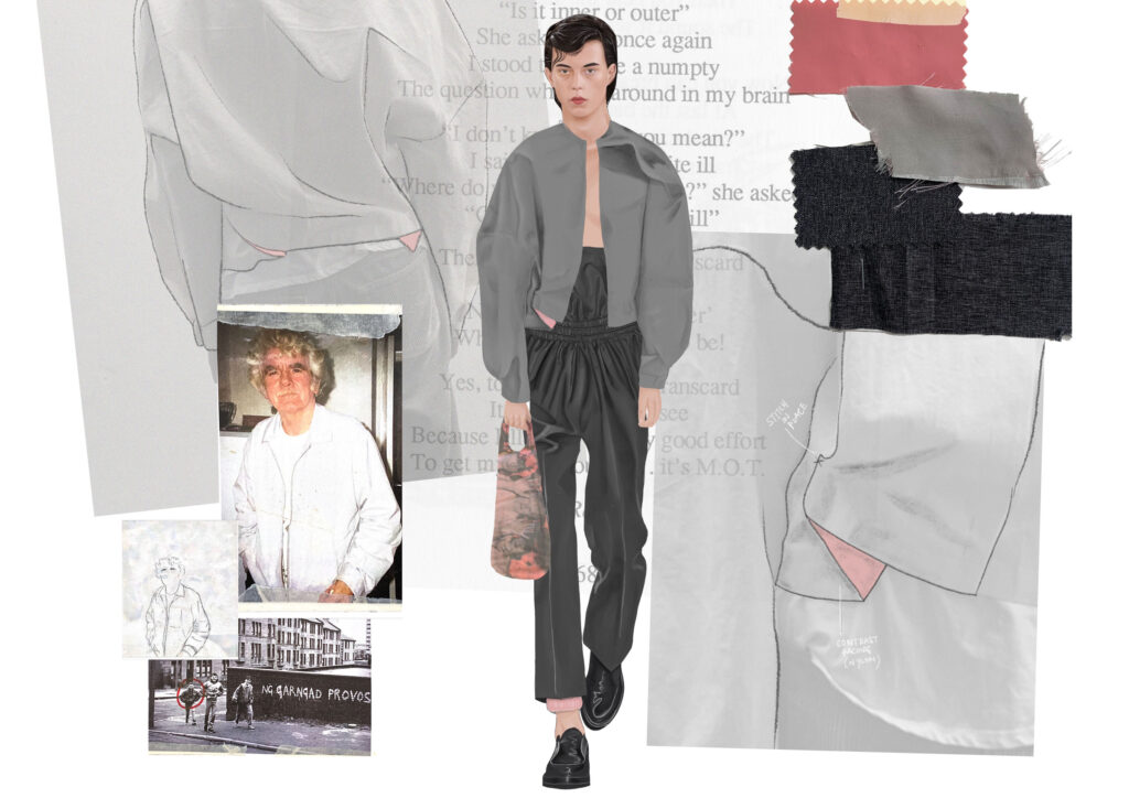 Distorted jacket inspired by photograph of my Grandad with exaggerated high waisted tailored trousers.