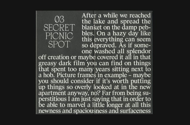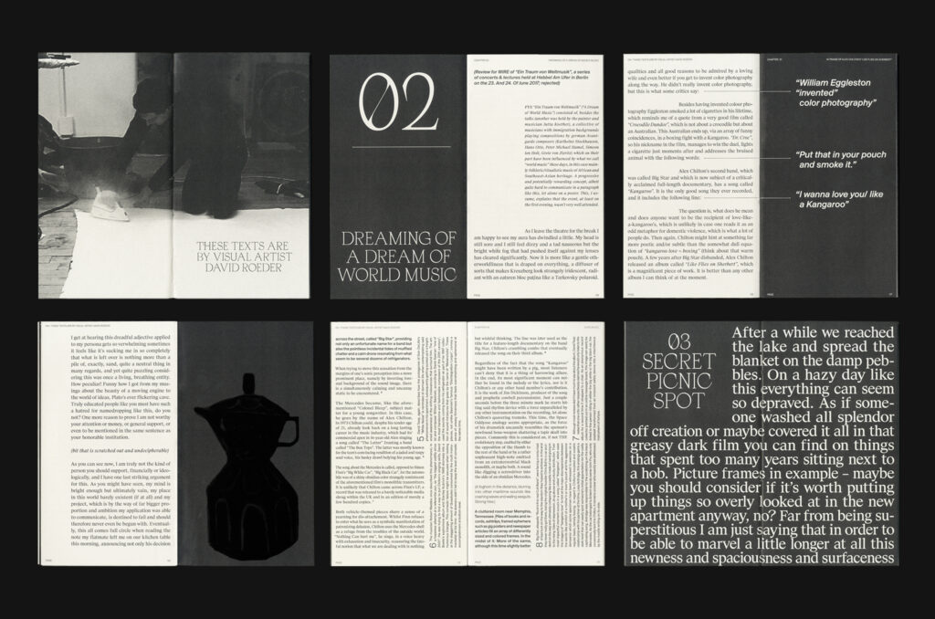 Publication project using written works from German visual artist David Roeder. The brief required the design of an affordable publication that could accompany the artist’s exhibitions. Employing extreme care of the books typography, the rhythm of reading and above all the use of different layouts, the project is a sober but captivating publication outcome.