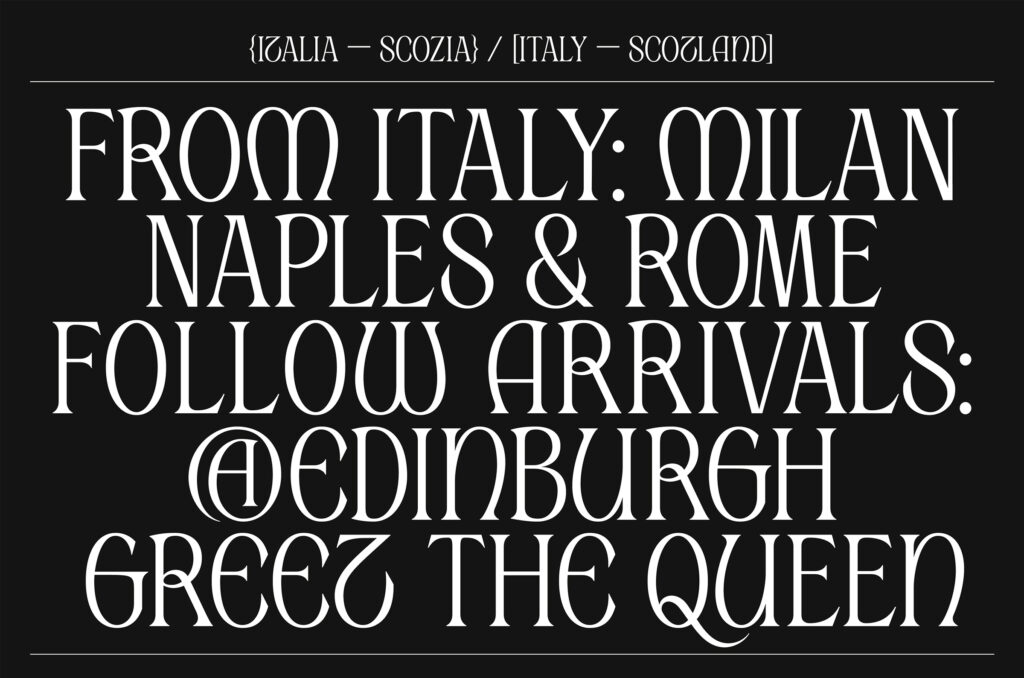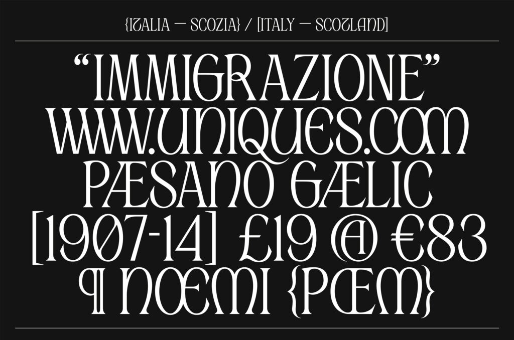 Diaspora is a display font exploring Italian immigration to Scotland between 1880 and 1920. A diaspora emerged to such an extent that the Scot-Italian became recognisable as a fully fledged persona encompassing characteristics of both cultures. Diaspora expresses these hybrid identities of Italians who immigrated to Scotland. This is translated by the addition of seven alternates for the letters A, E, M, N, T, U, V and W. To underline the concept of immigration by the means of type-design, the traditional and iconic aspects of lettering from both countries are emphasised. While having their own characteristics, Diaspora’s letters are designed on a single basis structure, helping to create a harmonious set. Each user can develop their own identity of the font using alternates. Diaspora is available on request through the GOODEGGS Type Foundry website: [www.goodeggstypefoundry.com](www.goodeggstypefoundry.com); or you can drop us an email to hello@goodeggstypefoundry.com