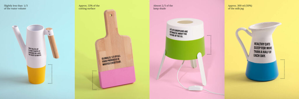 A series of found product design objects that were transformed to express the functionality of graphic design by communicating data through their form. Each object was altered through color and typography to inform the viewer about statistical information, helping them imagine outcomes and possibilities of the data shared. The objects were measured, marked and spray painted manually. The typography was vinyl cut and applied by hand. For more project details and images, please visit www.zzzzarko.com.