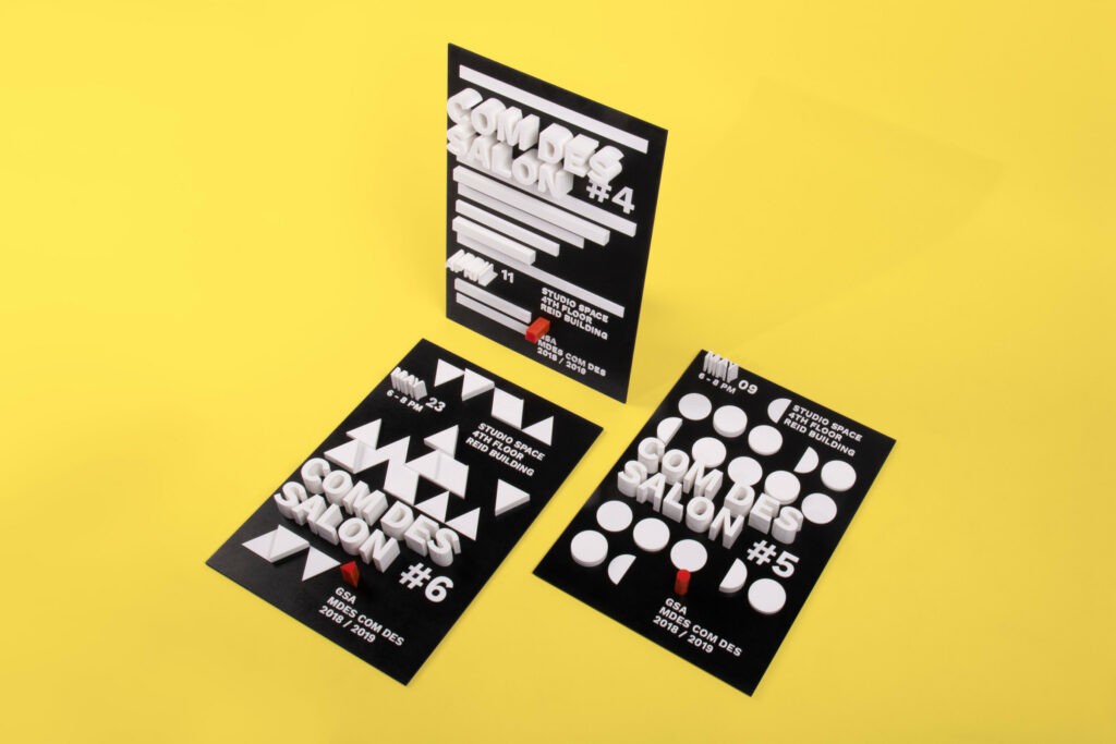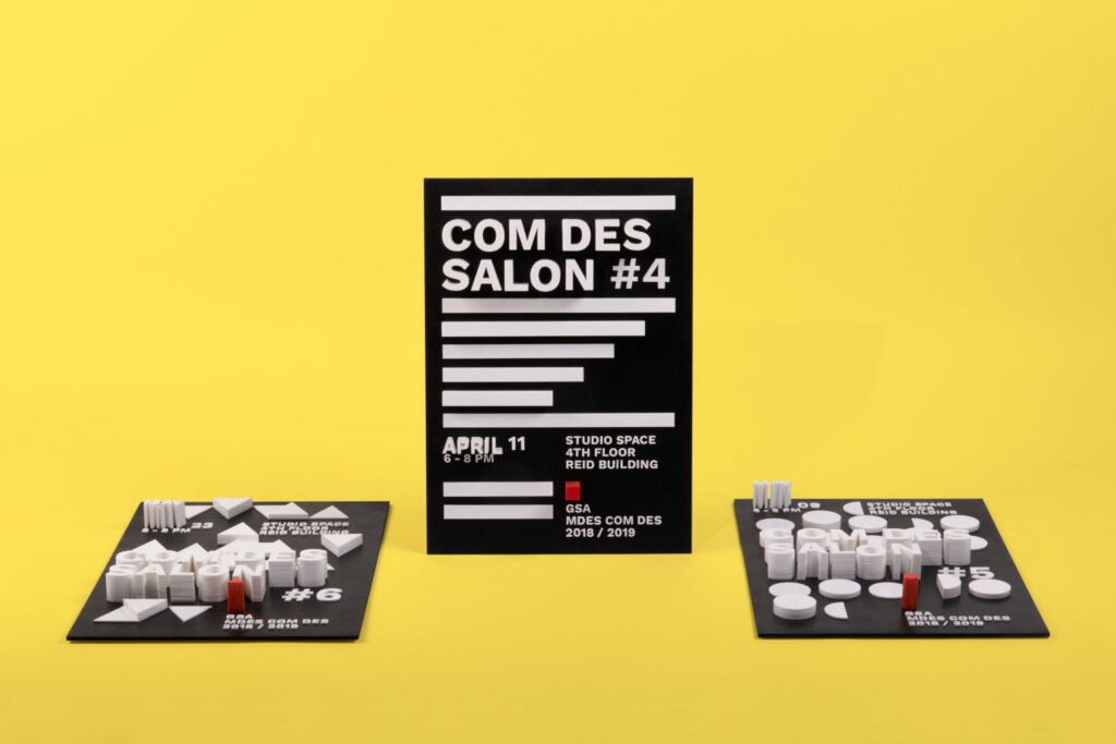 A sculptural poster series developed as part of the research into the effect of three-dimensionality on the traditionally two-dimensional field of graphic design. The posters are made out of over 500 laser-cut acrylic pieces that were hand-assembled and manually attached to painted wooden backgrounds. The topic of the posters are the ‘salon’ meetings that the Com Des Master’s students have organised to exchange ideas. For more project details and images, please visit www.zzzzarko.com.