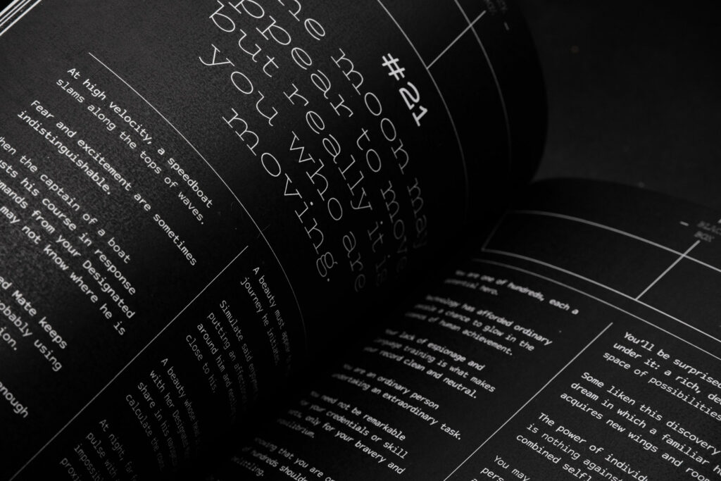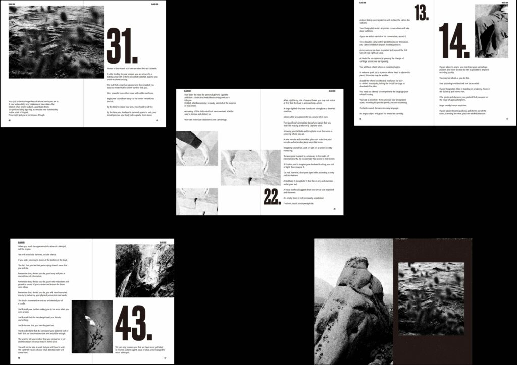 “Black Box” is a science fiction short story by Jennifer Egan. The story is in the form of "mental dispatches" from a spy in the near future and was emanated on Twitter meaning each chapter is very short due to the platform’s limitations. The project was an exercise in both matching layout to features in the story with only black and white printing applied to convey tension and coldness throughout the story and the choice of decoration and illustration helps provide an immersive reading experience