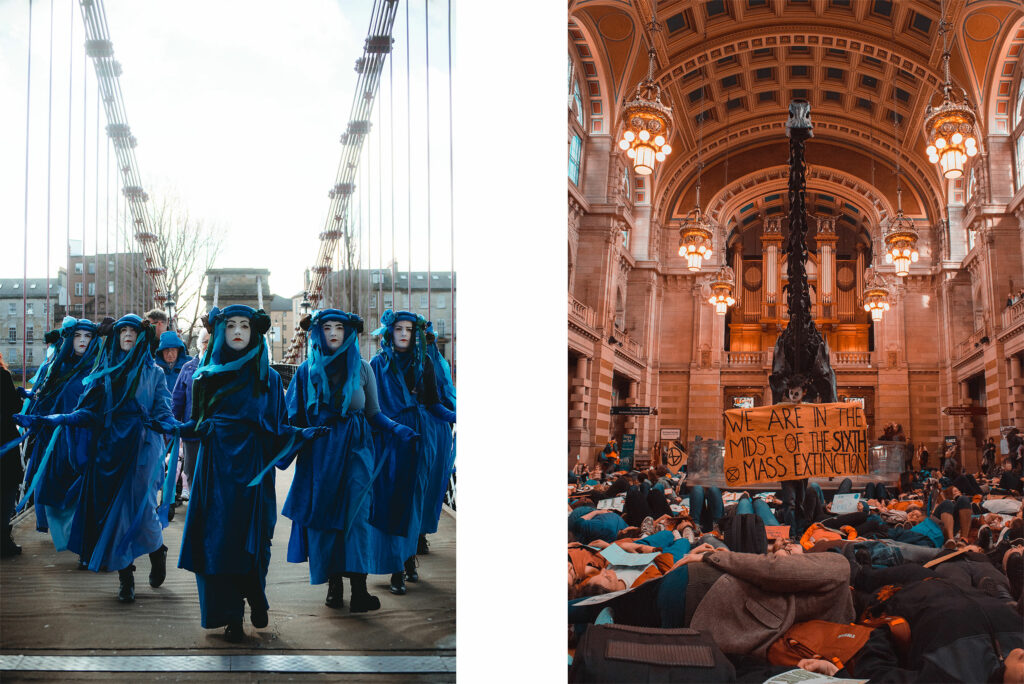 Left: On Leap Day 2020, XR Glasgow organized the secondo Blue Wave event of the city. Silent as the rising sea levels, step by step, centimeter by centimeter, just like water does, the Blue Brigade walked slowly from the bridge towards the people gathered in the Clyde Amphitheatre. Then proceeded leading the march through the city center of Glasgow, all the way until Buchanan Street steps. Right: Kelvingrove Museum, 3pm. Kids and parents together under the gigantic skeleton of Dippy the Dinosaur. Grandparents, too. To the sound of a violin, the signal, everybody lay on the floor. Under Dippy's skull, several kids turned around and around holding a sign reading: ‘We Are on the Midst of the Sixth Mass Extinction’. They were silent, the kids. Many were dressed as animals, or with animal masks. Some had dinosaur toys. They lay down for about twenty minutes, holding signs and banners on their chests. The banners were reading: ‘Are we next?’ [Published on The Guardian]