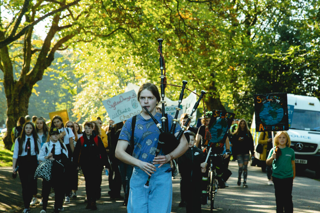 A group of school students lead by a young student playing the bagpipe joins the crowd in Kelvingrove Park for the third Global Climate Strike. About 12,000 people participated in the strike, an impressive number if compared to the few hundred of the first strike in February. From Kelvingrove Park, strikers (families, students, elders, workers) marched through the West End and all the way to George Square, in front of the City Council. The youth strikes in Glasgow are autonomously organised by students under the age of 18, who plan the route, the actions, stewarding and police liaison, speeches, and so on.