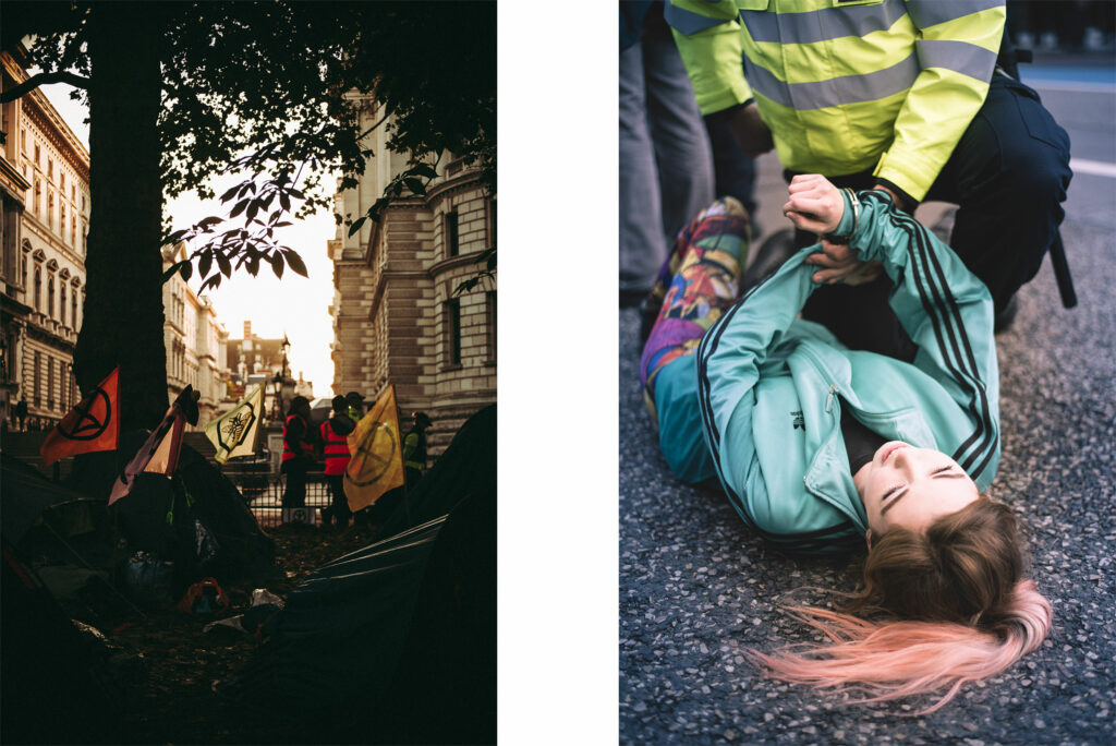 Left: Central London, 6am. As part of the strategy or peaceful disruption, XR activists occupied public parks and organised well-structured campsites, with an open kitchen, toilet area, regenerative zones, and assembly tents. Stewarding was coordinated by Extinction Rebellion, while additional police force was monitoring the camp. Right: A teenage girl in the process of being arrested during the protest in Millbank, central London. XR activists are educated on their rights, as well as in non-violent behaviour in case of arrest, before taking any kind of disruptive action. Refusing to move means having to be physically handled by police when carried away.