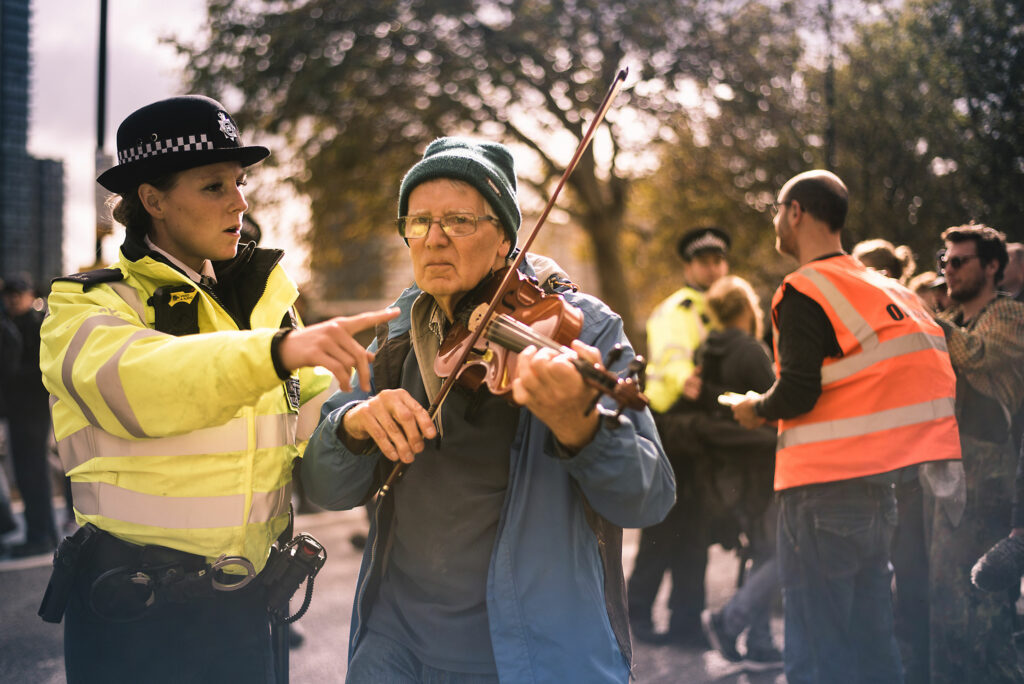 “He had been playing since it all started when they began moving everyone out of the road. When the arrests began he didn't stop. One song after the other, he was accompanied to the sidewalk on one side just to turn back at the last moment and head to the opposite side, back and forth from where the people sitting on the road were waiting to be arrested. A bright sunny day in London, and in the middle of the road he was cheering everyone up, and making the police desperate because who wants a violin to stop playing? Back and forth, eyes fixed on something only he could see, and a rejuvenated smile every time he paused and people clapped for him beyond the police line. Making his difference, one tune at a time.” [Continues]