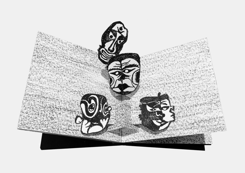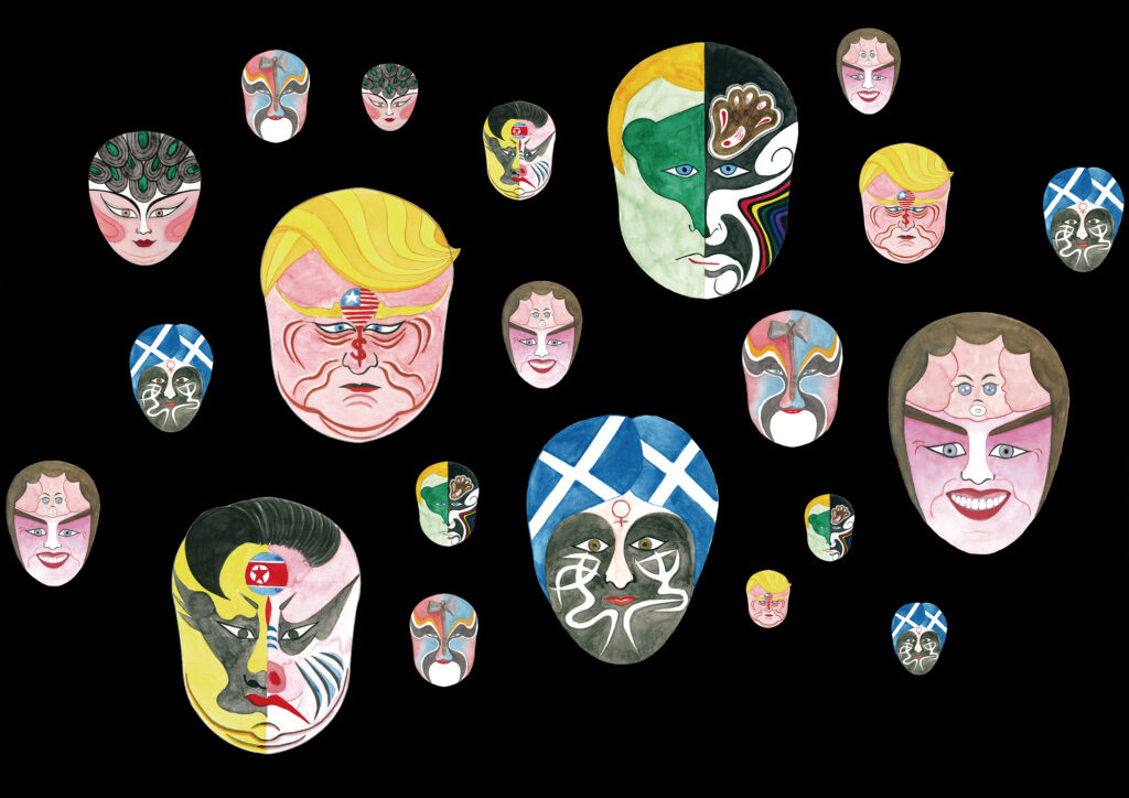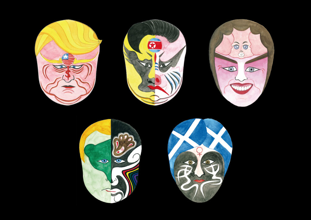 The iconic masks of the Chinese Peking Opera use colour and pattern to imply characters' various personality traits, such as connotations of benevolence and malevolence. Using the same methodology, masks of well-known political figures have been approached and reconfigured to create new portrayals alongside characters from the novel Boule de Suif: Donald Trump, Kim Jong-Un, Vladimir Putin, Jacinda Ardern, Nicola Sturgeon, Mrs Loiseau, Boule de Suif and Thor.