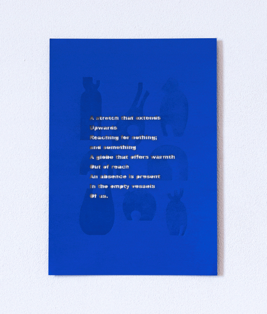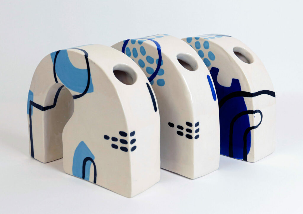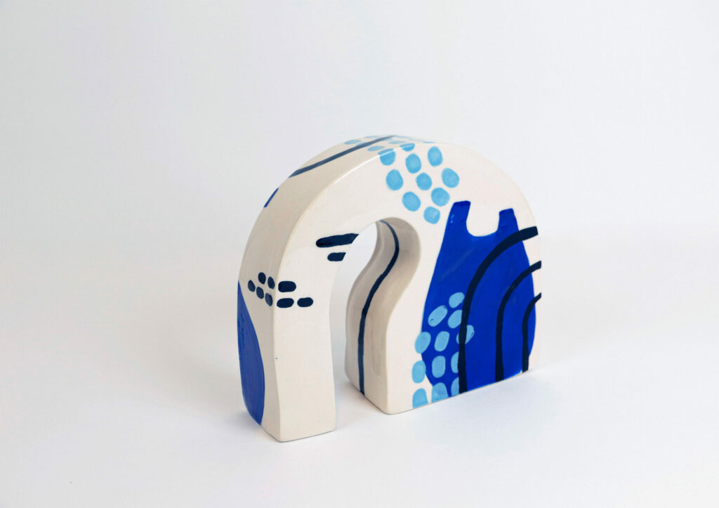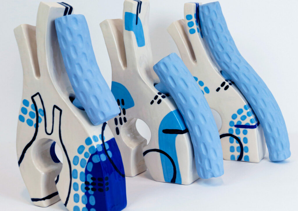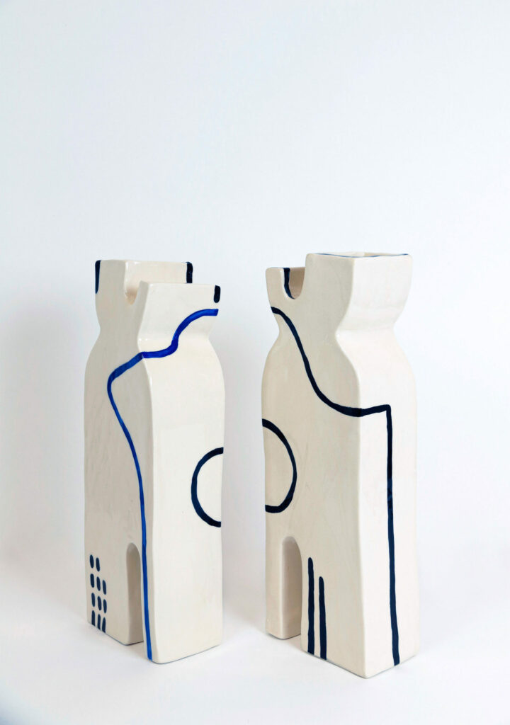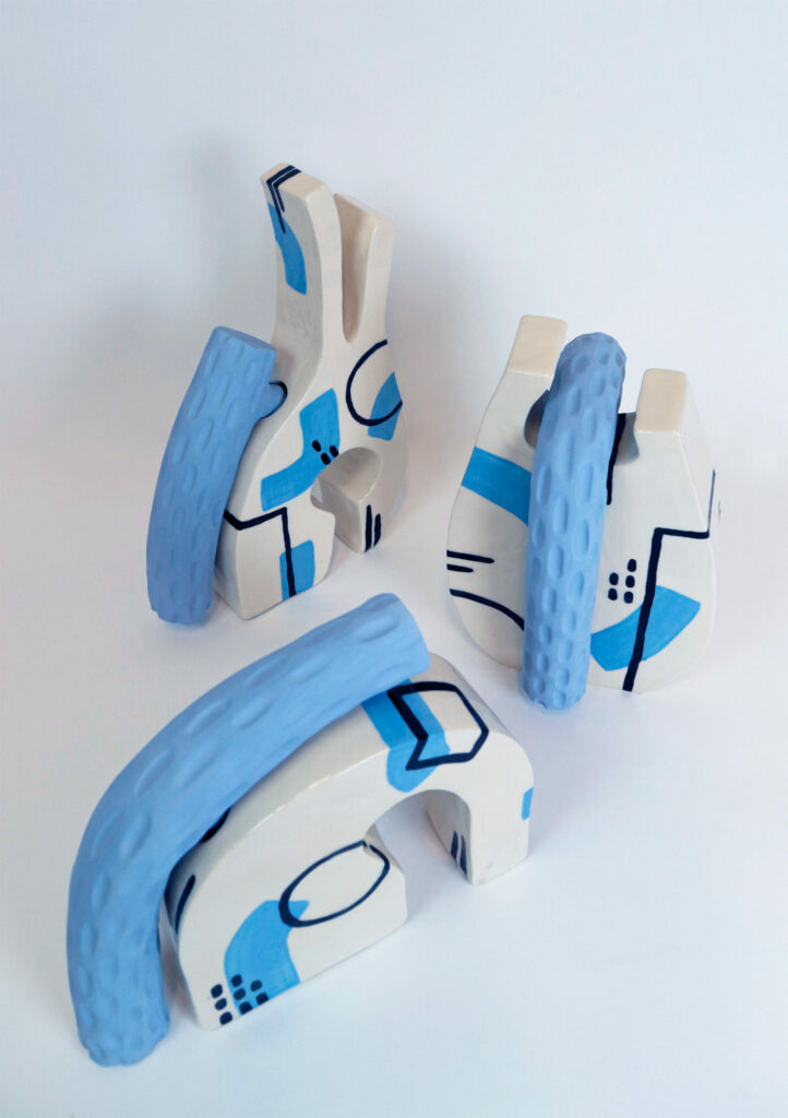 The Presence of Absence collection continues on from The Empty Vessel series. Following the journey of moving past grief and the absence left within. These vessels have complementary forms that slot together, completing the exterior and creating a whole form. Striving to create a perfect aesthetic resolve, painting a mirage of a formed and complete psyche. The absence that grief maintains as a presence in our psyche, extends outwards and has not only emotional implications but also material and social ones. The void reshapes and redefines our reality. As individual pieces each still occupy the role of The Empty Vessel but when put together they contain the absence within, allowing their external qualities to find a full form. The addition of the blue tubular appendages reference the unaffected personality, the raw emotional state of the individual. They hold close in embrace the exterior of the white slab vessels. They act in support of the affected form, adding a further dimensionality to the perceived complete object.
