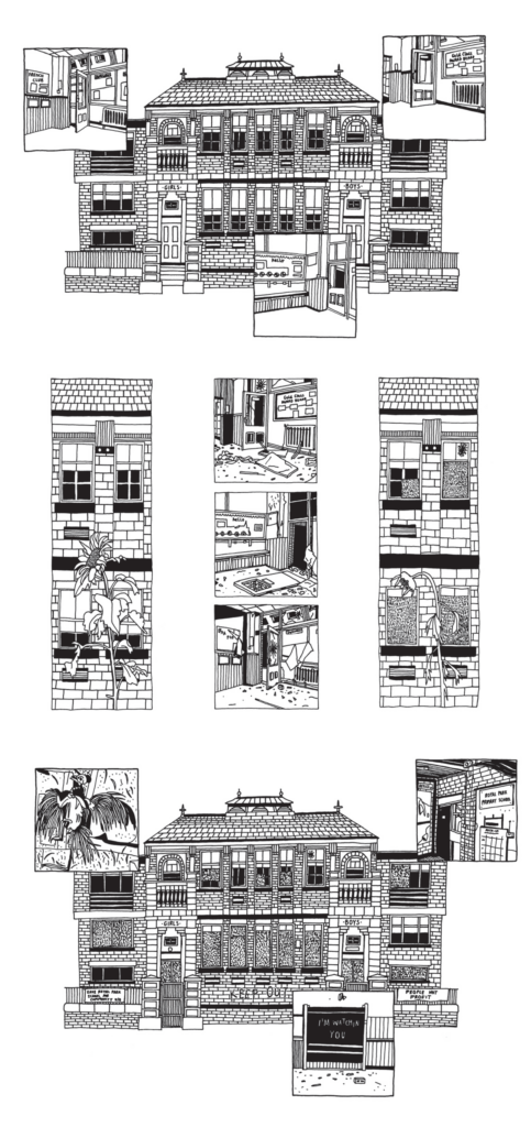 Royal Park School was bulldozed by Leeds City Council in 2014, after almost a decade of campaigning and fundraising to turn it into a community hub. The space has been empty ever since. The work aimed to challenge the traditional ideas of a comic, and see whether it could successfully function without the inclusion of any characters or written narrative. The use of repetition and aspect-to-aspect transitions act as visual prompts for the reader to infer their own meanings and storyline.