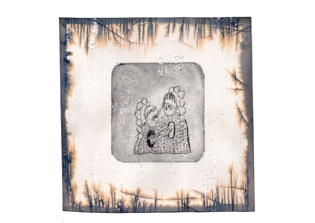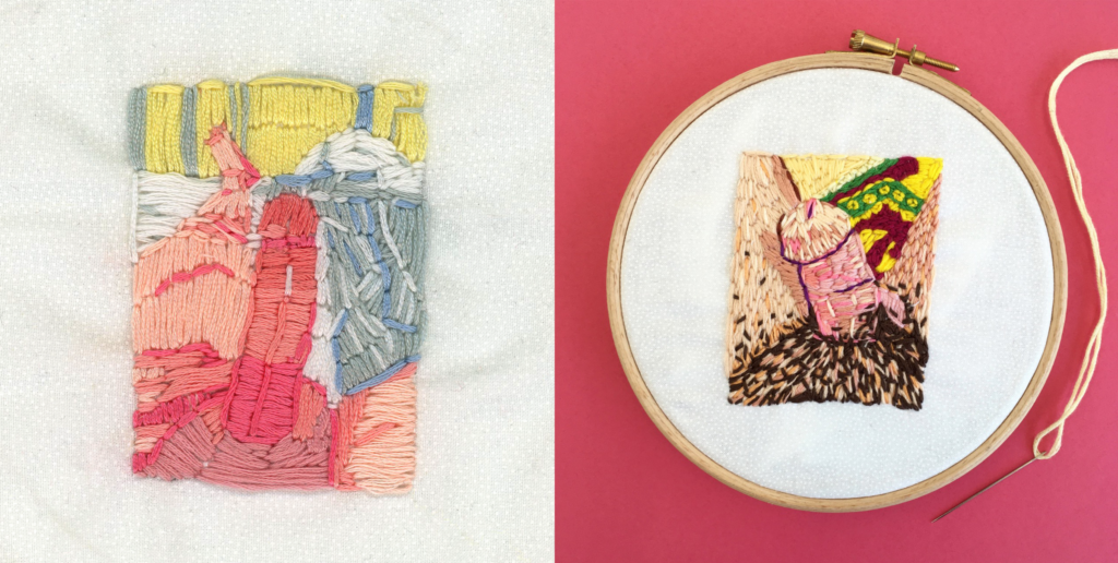 The embroidered pieces draw instant connotations with feminine and tactile craft: the soft threads and muted colours encourage the viewer to touch the work, and create a tension between the message and the medium. Unsolicited dick pics are often sent via social media platforms such as Instagram and Snapchat, where they disappear once viewed. In contrast to this, the permanent and labour-intensive processes of etching and embroidery preserve what we can assume were intended as temporary records of sexual harassment.