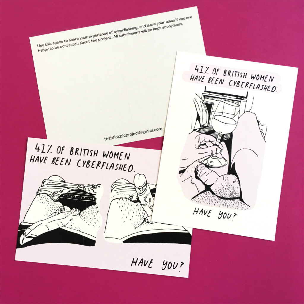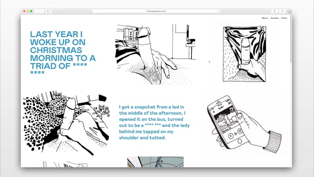 41% of British women aged 18-36 have received an unsolicited dick pic.1 Through open submissions over the past two years people have been sharing their stories, experiences, and images of cyber flashing, which have been retold and represented through explorations across different media. The project aims to create discourse around this rarely discussed yet prevalent issue, as well as providing a platform for victims to take ownership of their harassment. 1 Smith, M. (2018) YouGov: Four in ten millenials have been sent an unsolicited penis photo