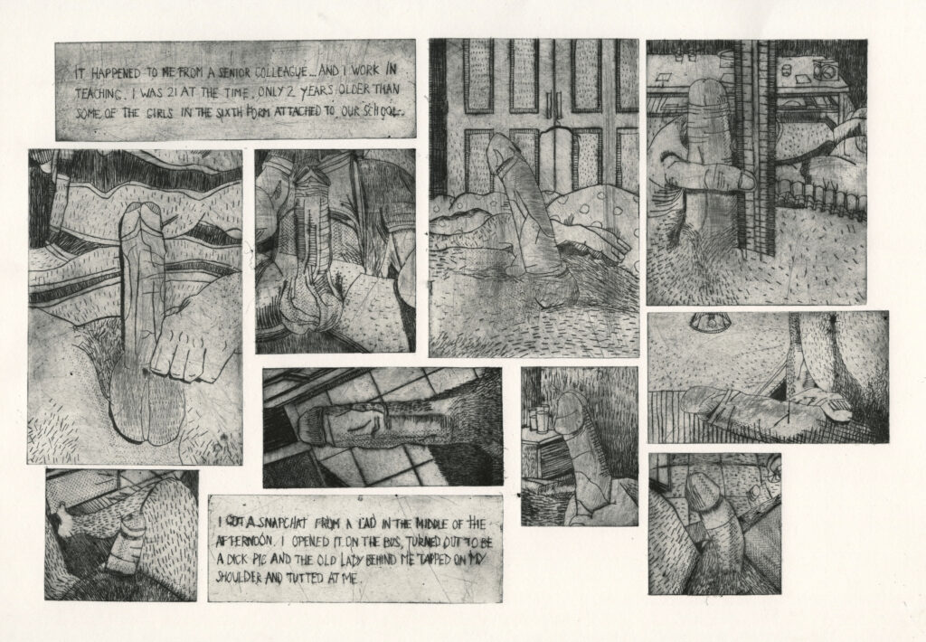 At the start of the project the images were developed in different media, considering whether presentation of the work through traditional methods of making would elevate the subject matter. Throughout the project theories of art and pornography were examined and challenged, both from the artist herself and her wider audience. Etching and printing the unsolicited dick pics immortalised them from throwaway, transient images into works of art. The traditional and highbrow status of the medium instantly elevates the work. Working on small individual plates allowed multiple images to be printed alongside each other, alluding to a carefully curated photo frame.