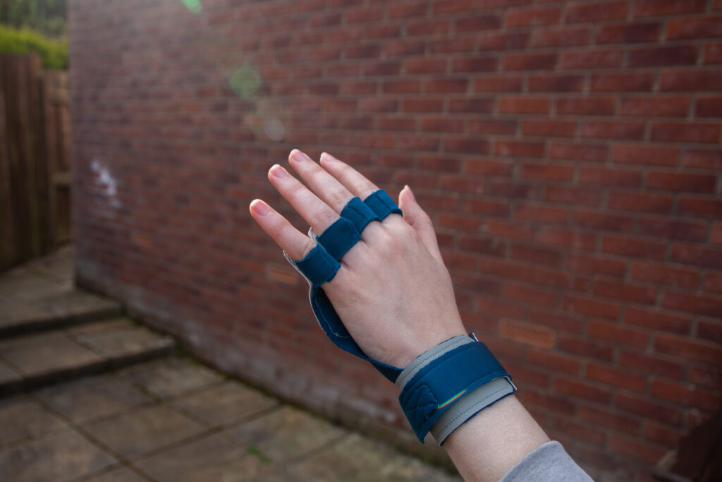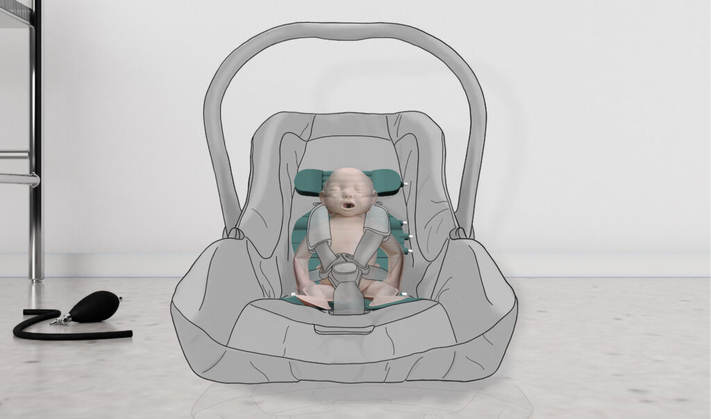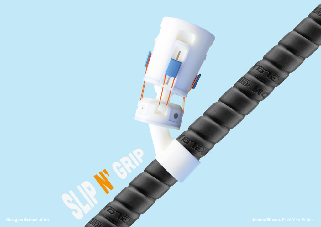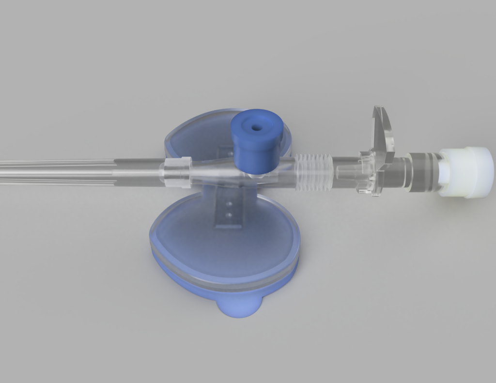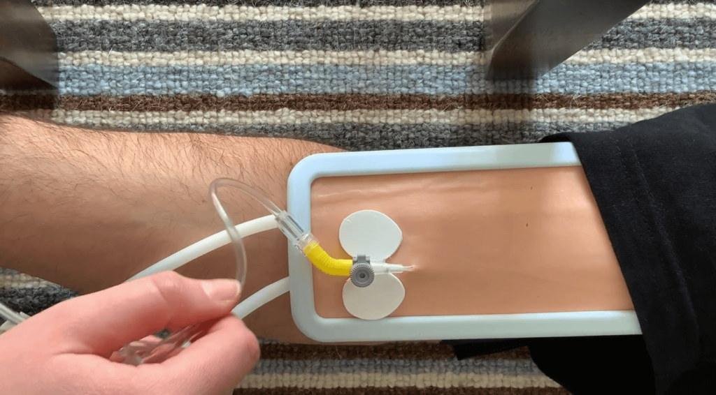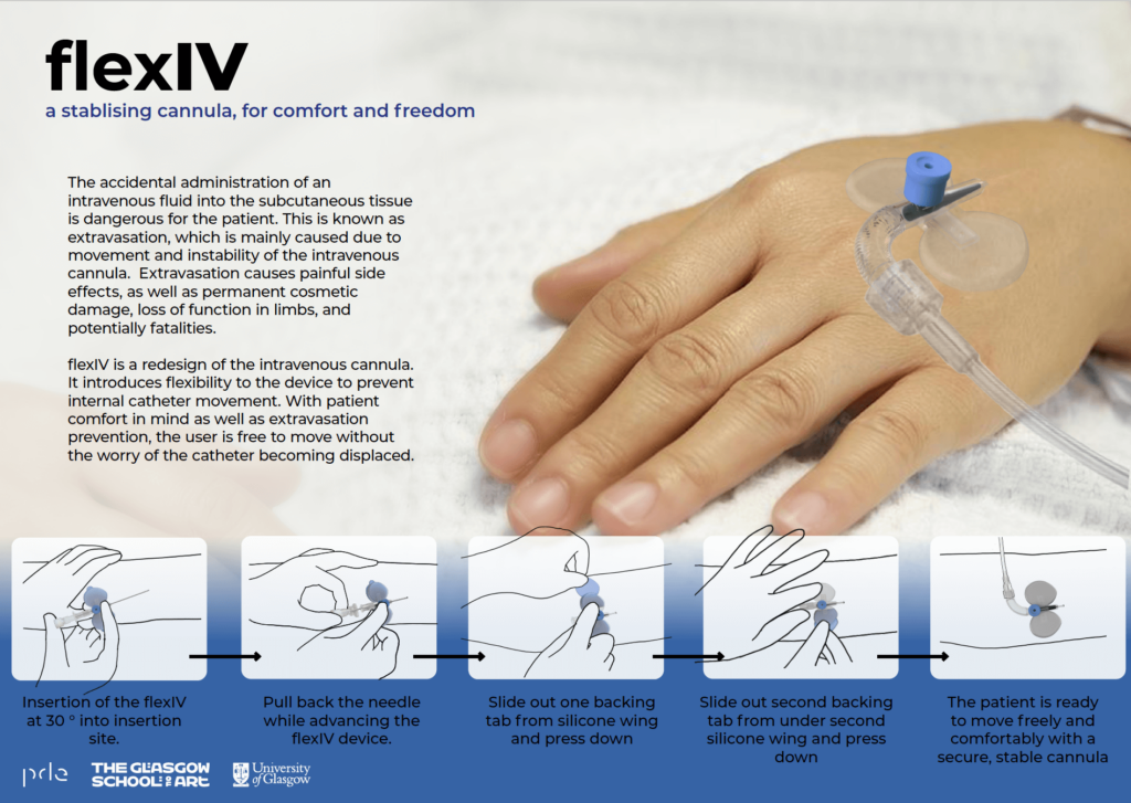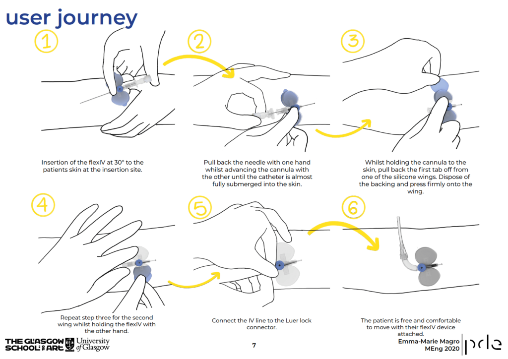A still from the prototype in action presenting the advantages of the flexIV deviceA still from the prototype in action presenting the advantages of the flexIV device including the accordion bend and the silicone adhesive butterfly wings.