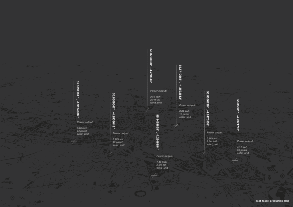 In order to create a fully_transparent_production chain material sources can be mapped. The same can be done for where the material is processed and where it ends up. By logging the location of material sources as well as manufacturing locations, an accurate CO2 embodied energy calculation can be made for each product. Transportation routes can be easily traced and therefore transport emissions easily calculated. As well as Gps location data, each base_unit will transmit how much power is being generated at each location. This will be processed, mapped and logged through the online network branch of the post_fossil_toolkit: the post_fossil_gateway, accessible via www.post-fossil-production-labs.com . By analysing this data, users will be able to optimise their tools across the city. In this way the wider post_fossil_system mimics micro-bacterial metabolic life-cycles and the city is transformed into a self sustaining macro-organism, powered from within itself, continuously evolving and adapting to environmental conditions.