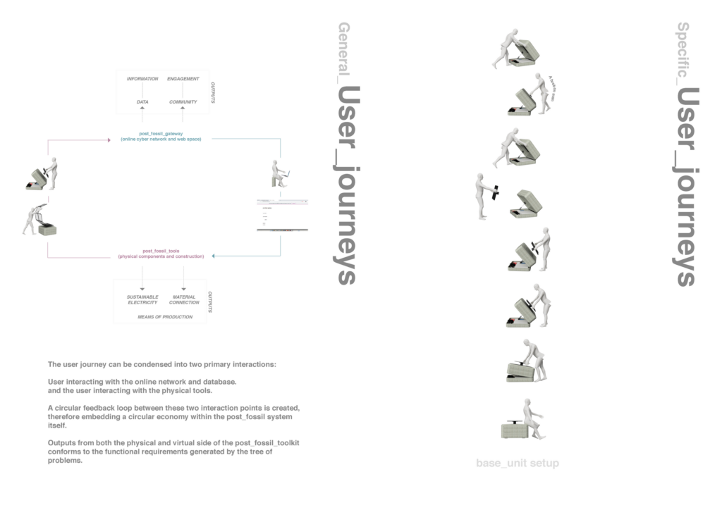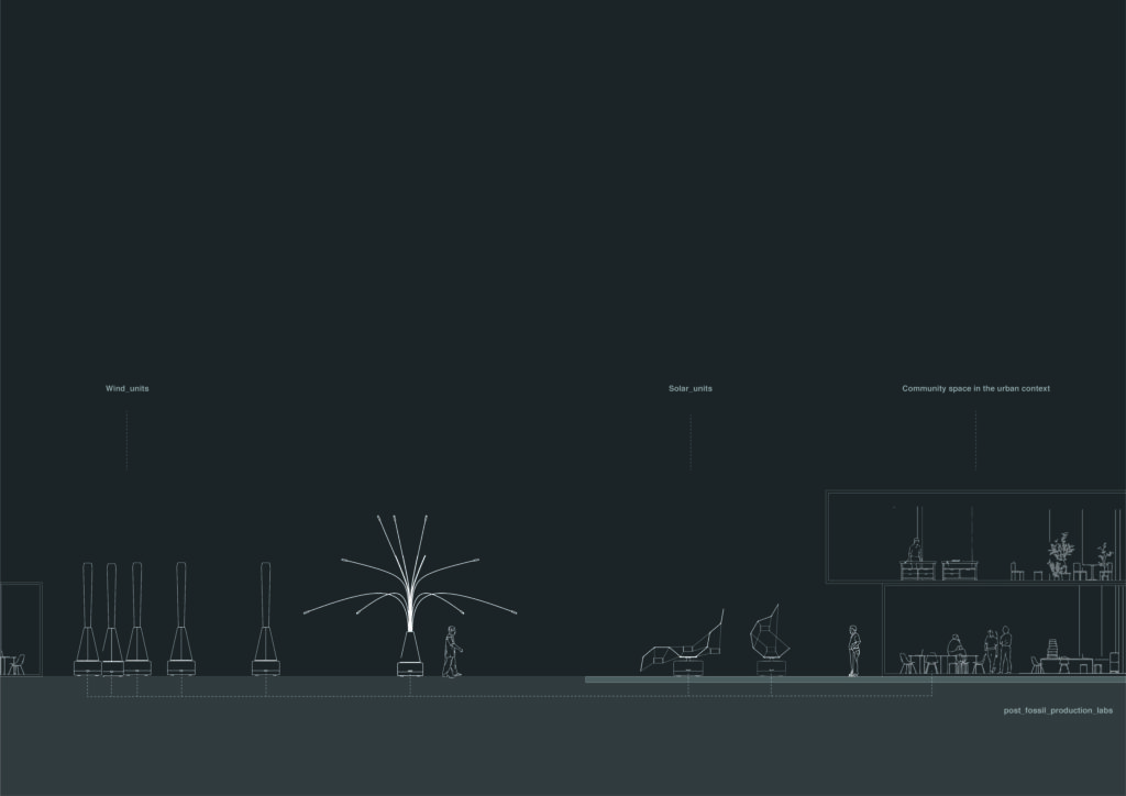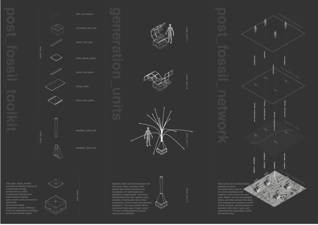 Inconsistency of environmental conditions across both time and location means that an effective, and democratic solution must be flexible and adaptable to specific locations. The post_fossil _toolkit promotes independence from expensive, time and energy consuming rigid infrastructure: Infrastructure without the economic and carbon cost. Generation_units feed electricity into the community space allowing it to function without necessarily engaging in the current fossil_based, capital driven energy systems.