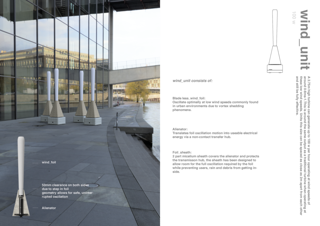 Currently under development, vortex bladeless technology occupies the cutting edge of experimental wind turbine design. By applying this technology in the post_fossil context, users will be able to harness the low level wind almost always present in the urban environment. Through localising production_technologies, such as wind turbines which are traditionally located far away from the urban environment, the means of production can be brought in almost direct contact with its produce. This in turn acts to reduce the alienated state of the user when engaging with the system.