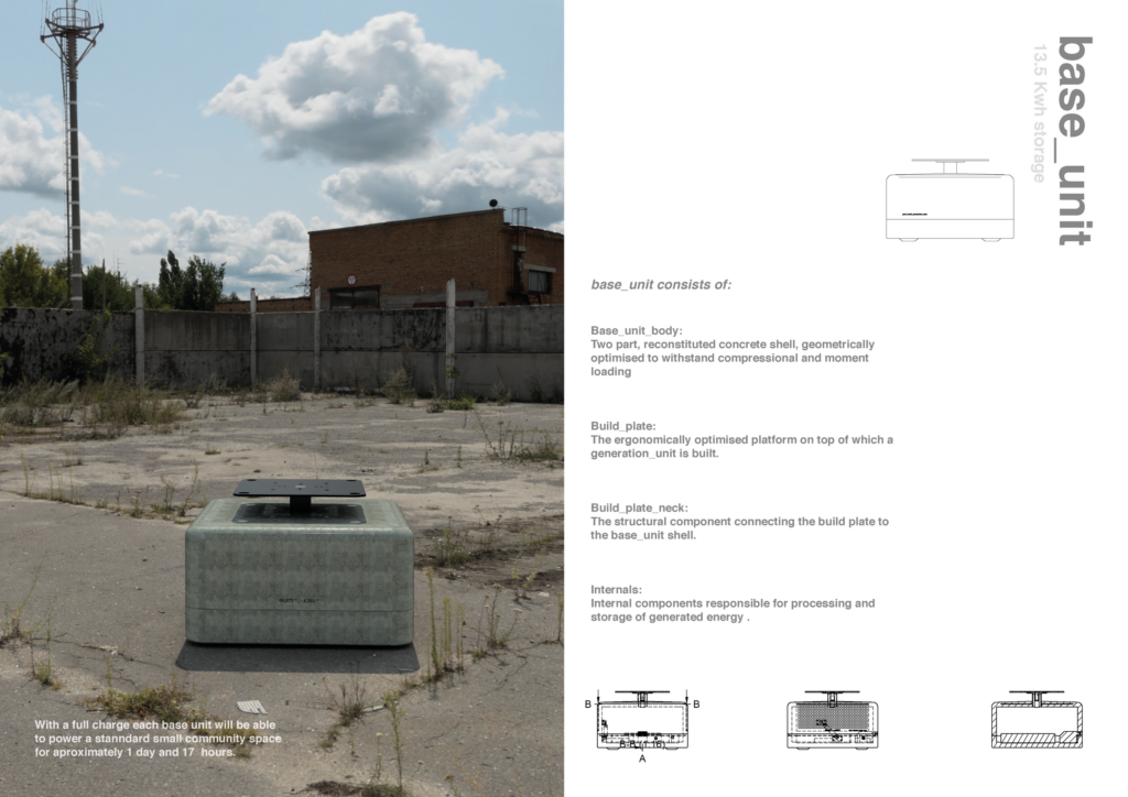 The base_unit acts as the fundamental building block, on top of which the required generation_tools are constructed. Each base unit contains a sub-system of internal components: live Current monitoring and transmission hub, combiner box, charge controller, tesla power wall rechargeable storage unit, signal convertor, and an standard output point.