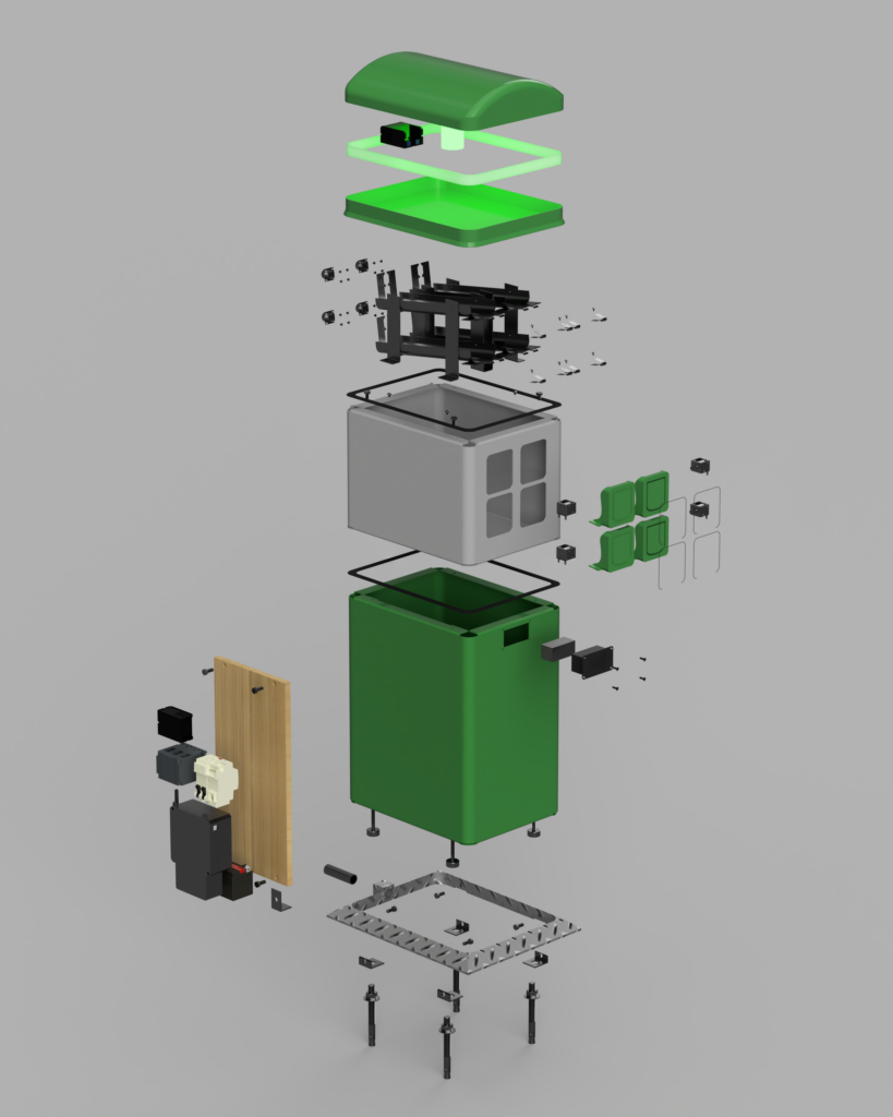 In order to work within the post_fossil_production_labs theoretical framework, democratic design should be implemented at every stage of the production and usage process. This means deconstruct-ability and modularity have been used to define the design of the units. Where possible standard fixings are used to fasten the components together, allowing the product to be fully disassembled into its constituent parts for ease of maintenance and recyclability.