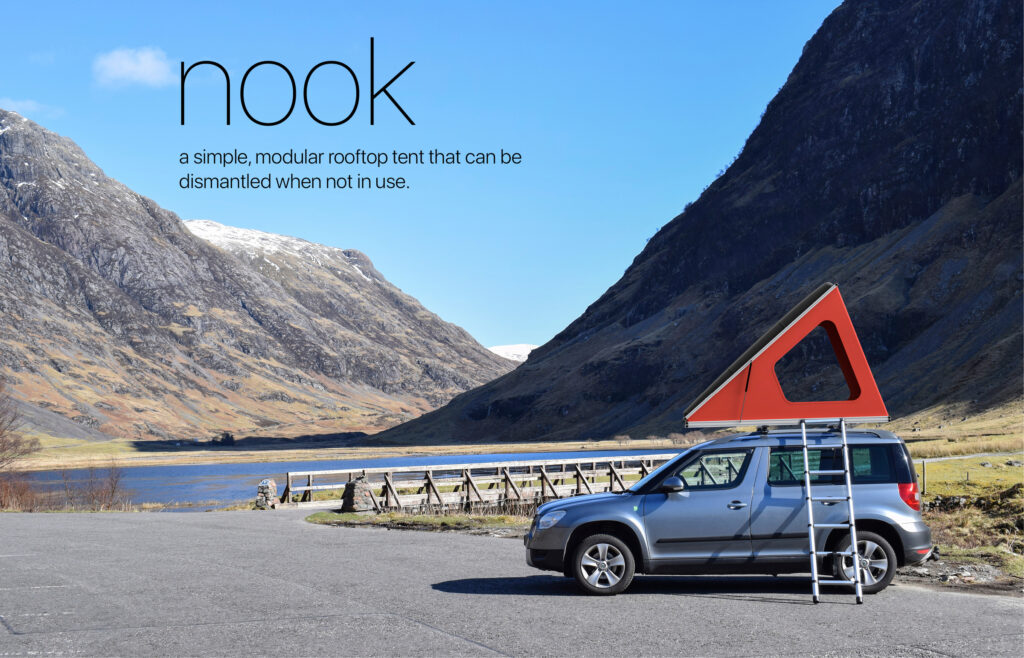 Nook is a rooftop tent for nomadic, adventurous people, that can be attached to the roof of any car. By means of a simple, reductive design, using low-cost and lightweight materials, the modular structure can be fully dismantled to occupy a much smaller footprint when not in use.