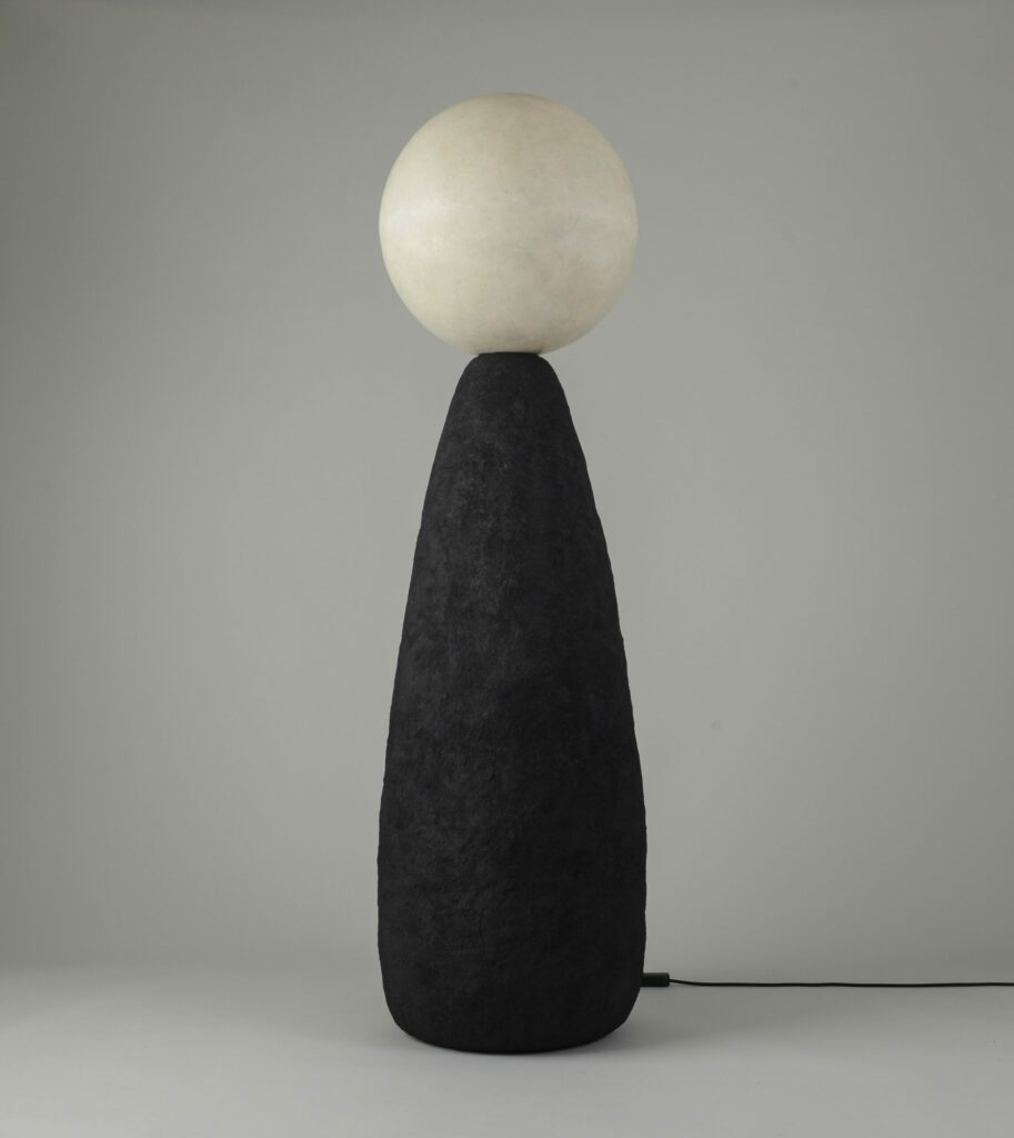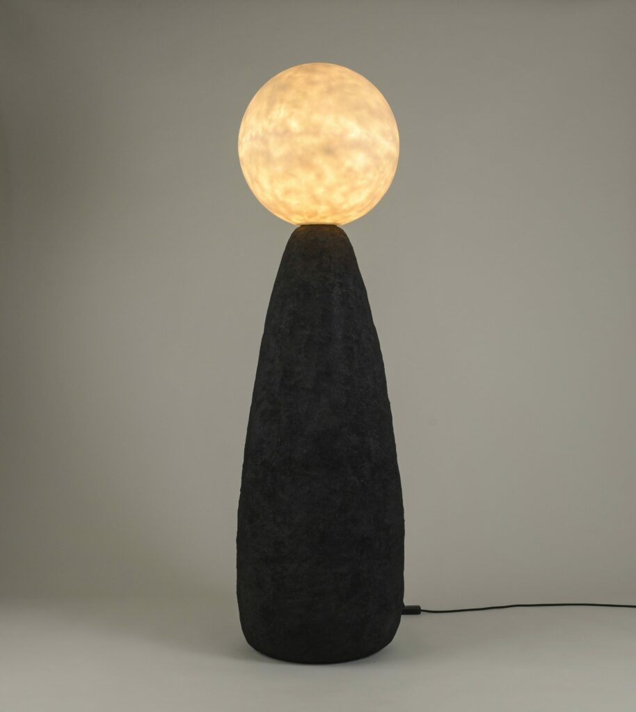 Hand sculpted from reinforced jesmonite and finished with synthetic enamel paint in a deep brown. The lamp shade is produced from a lightly pigmented fibreglass laminate and can be removed from the body when necessary. This piece measures 45x45x160cm and weighs roughly 21kg. This is a limited edition of 8 + 2 AP.