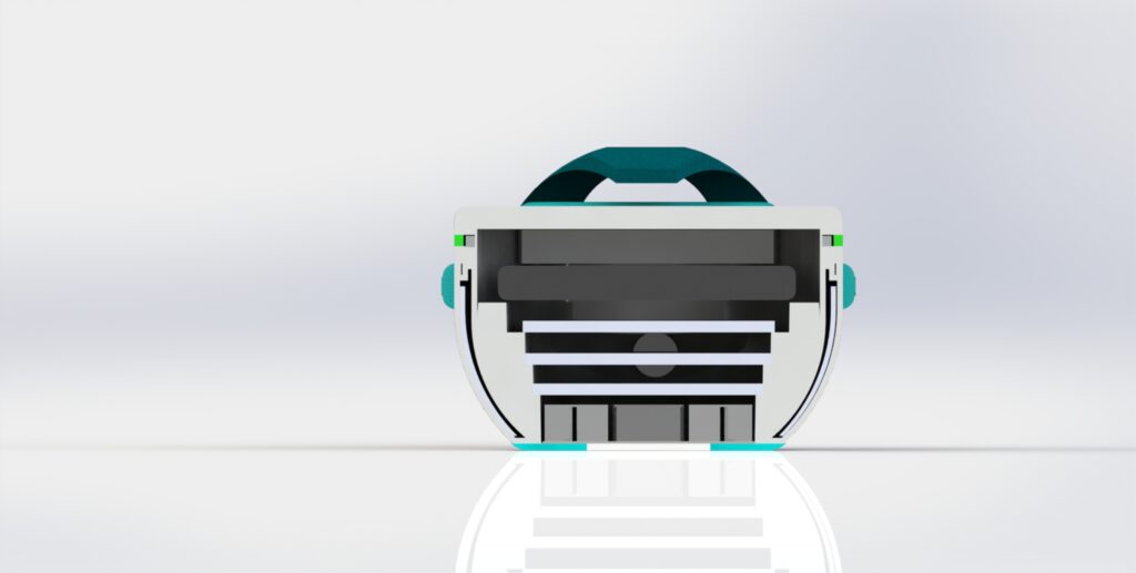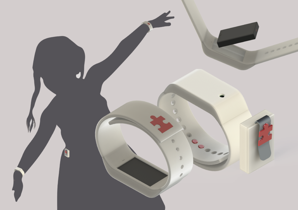 The silicone straps are interchangeable, so that the user can choose different strap designs to their liking. It is secured through the watch strap pin, which is shaped like a puzzle piece to symbolise and empower autism. –This aspect is based on the interviews conducted with the user group.
