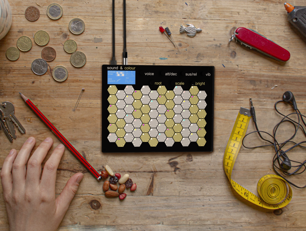 Sound & Colour is an audio & visual synthesis device with powerful musical learning and jamming potential. Unlike many commercially available “learner” instruments, Sound & Colour takes an alternative approach to learning music, focusing on allowing the user access to the mathematical concepts and relationships which dictate musicality without having to understand them! It uses an intuitive “harmonic table” layout to provide the user an ergonomic and accessible musical map. This layout places useful musical intervals close together and reduces chord memorisation, meaning all the triads (the backbone of western music) can be played with just two different fingers each with just one finger. It also features a helpful colour changing LED display dispersed across the keyboard. This display helps the user to familiarize themselves with the tonal layout and to navigate the keyboard, instantly locating recognizable intervals through colour recognition. Finally the Sound & Colour features a simple yet powerful sample based synthesis engine. This allows the user to select different sounds and modify them to their taste, without getting bogged down in deep parameter manipulation. It features 8 note polyphony that allows the structure of rich chords and deep melodies and harmonies.