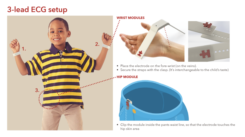 Communicare consists of 3 ECG modules, worn on both right and left wrists, and the right hip. These ECG modules communicate through Bluetooth connection, forming a 3-lead ECG setup. This setup is used, because it increases the overall accuracy of the product. It enables in-depth cardiac analysis, since ECG features such as HRV and ectopic beat are linked to the autonomous nervous system, which is triggered by the flight or fight response. In other words, stress can affect our ECG activity.