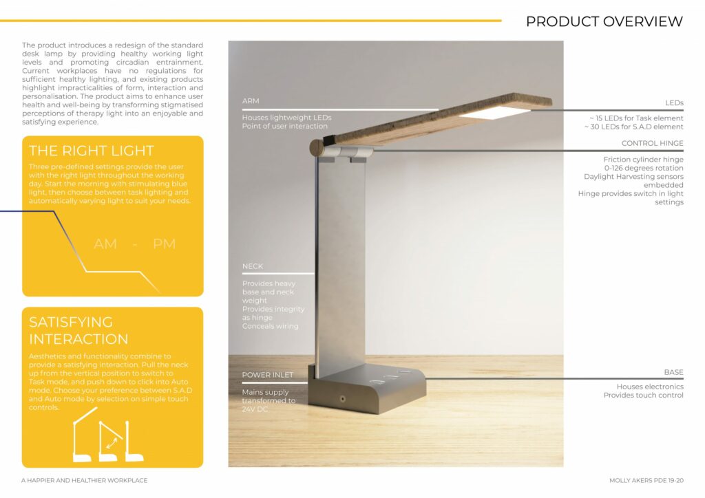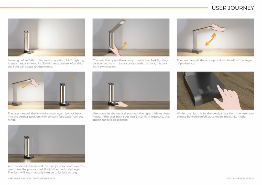 Whilst the light is in the vertical position, the user can choose between on/off, Auto Mode and S.A.D. Mode by simple touch interaction. Auto Mode provides ambient smart lighting by varying depending on the surrounding light levels.