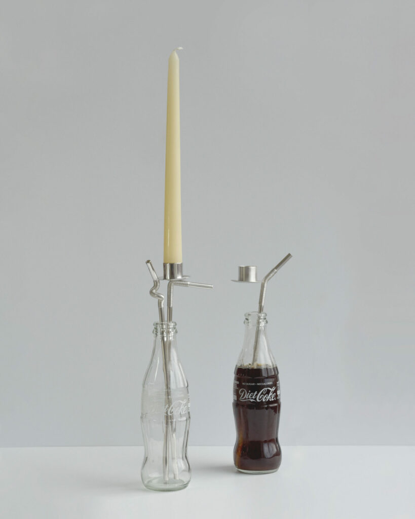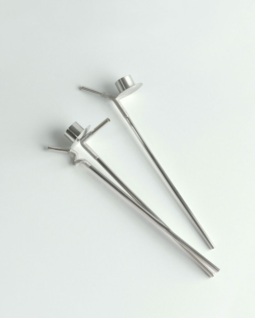 Precious white metal (could be hallmarked), Size: double-straw candlestick 77*40*263mm; single-straw candlestick 39*72*260mm