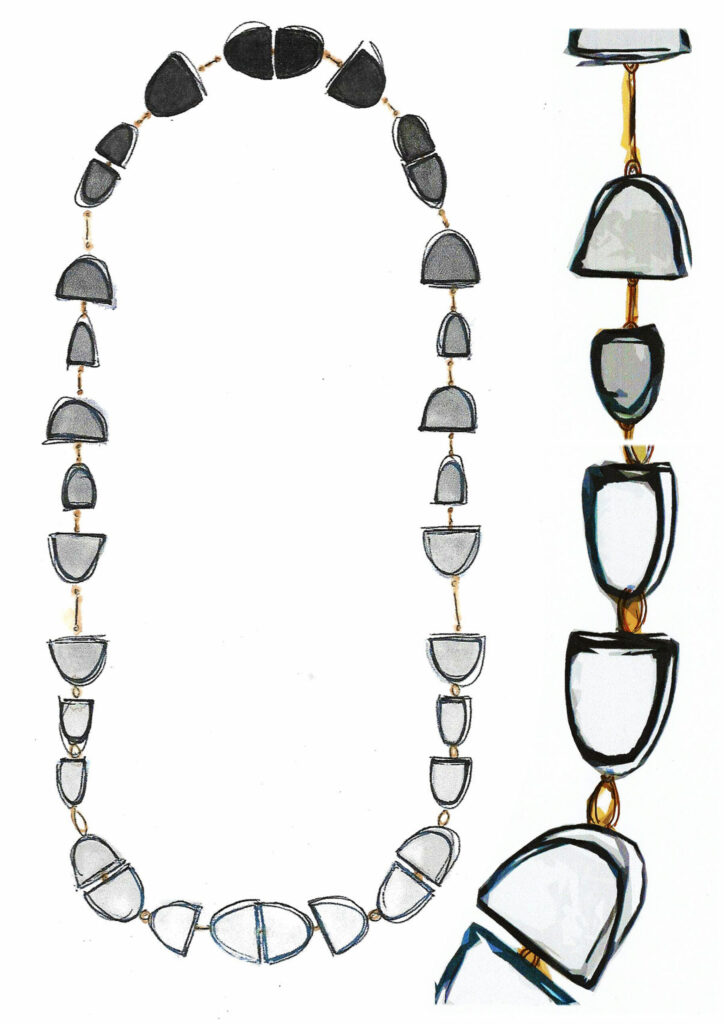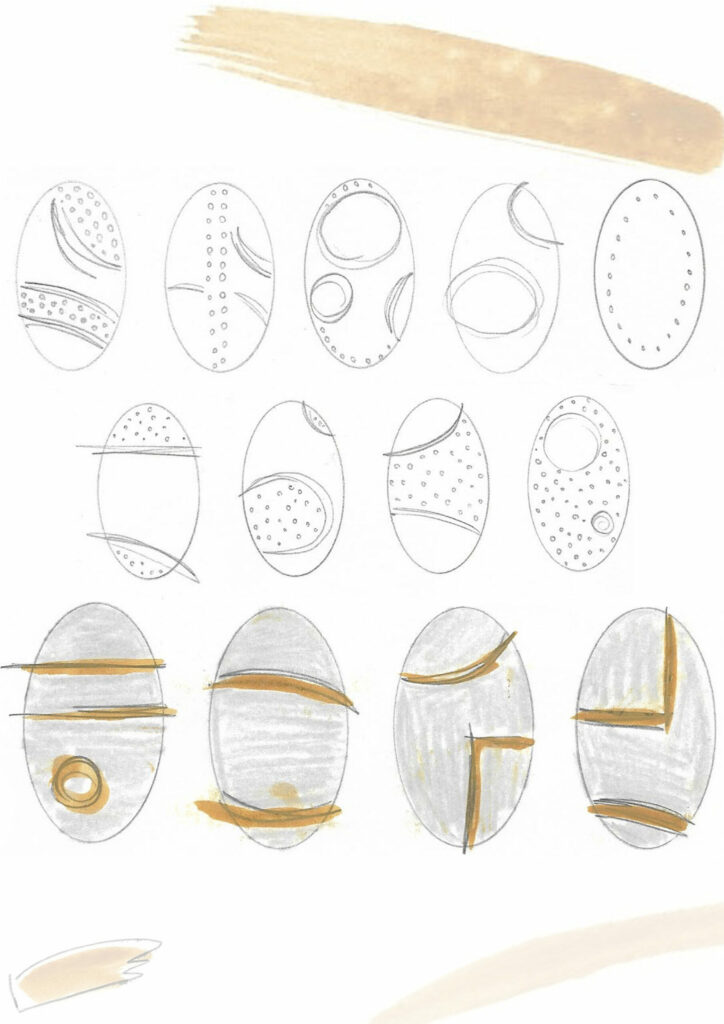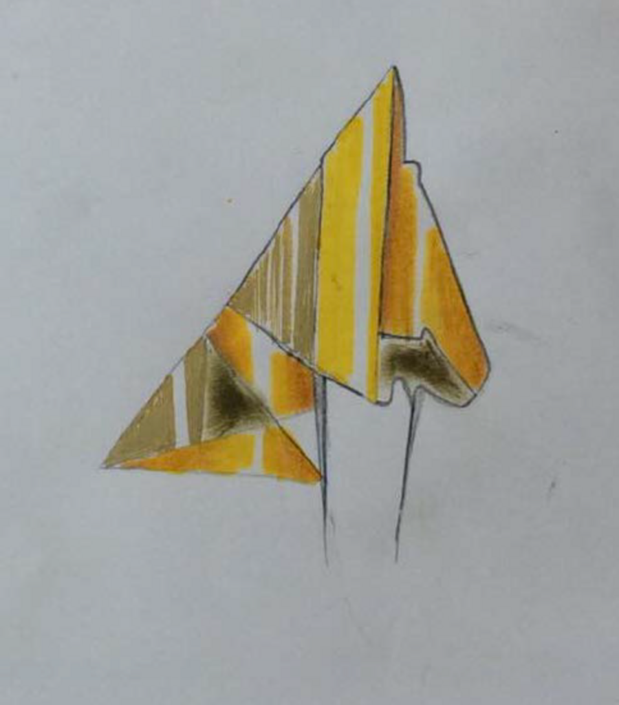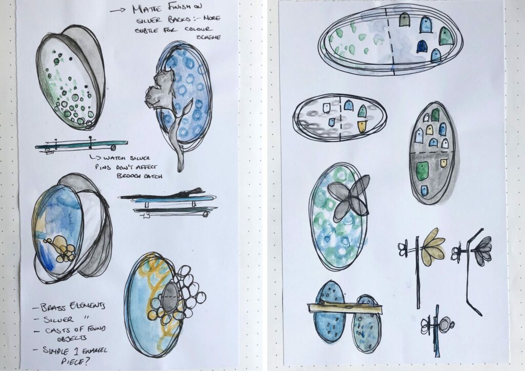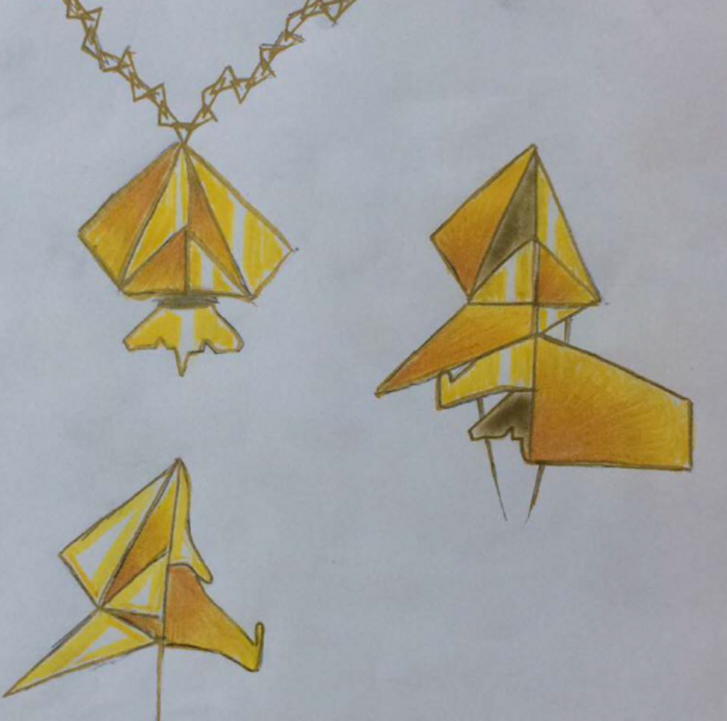 Goldsmiths brooch concept drawing. Derwent colorsoft, gold pen. 2019