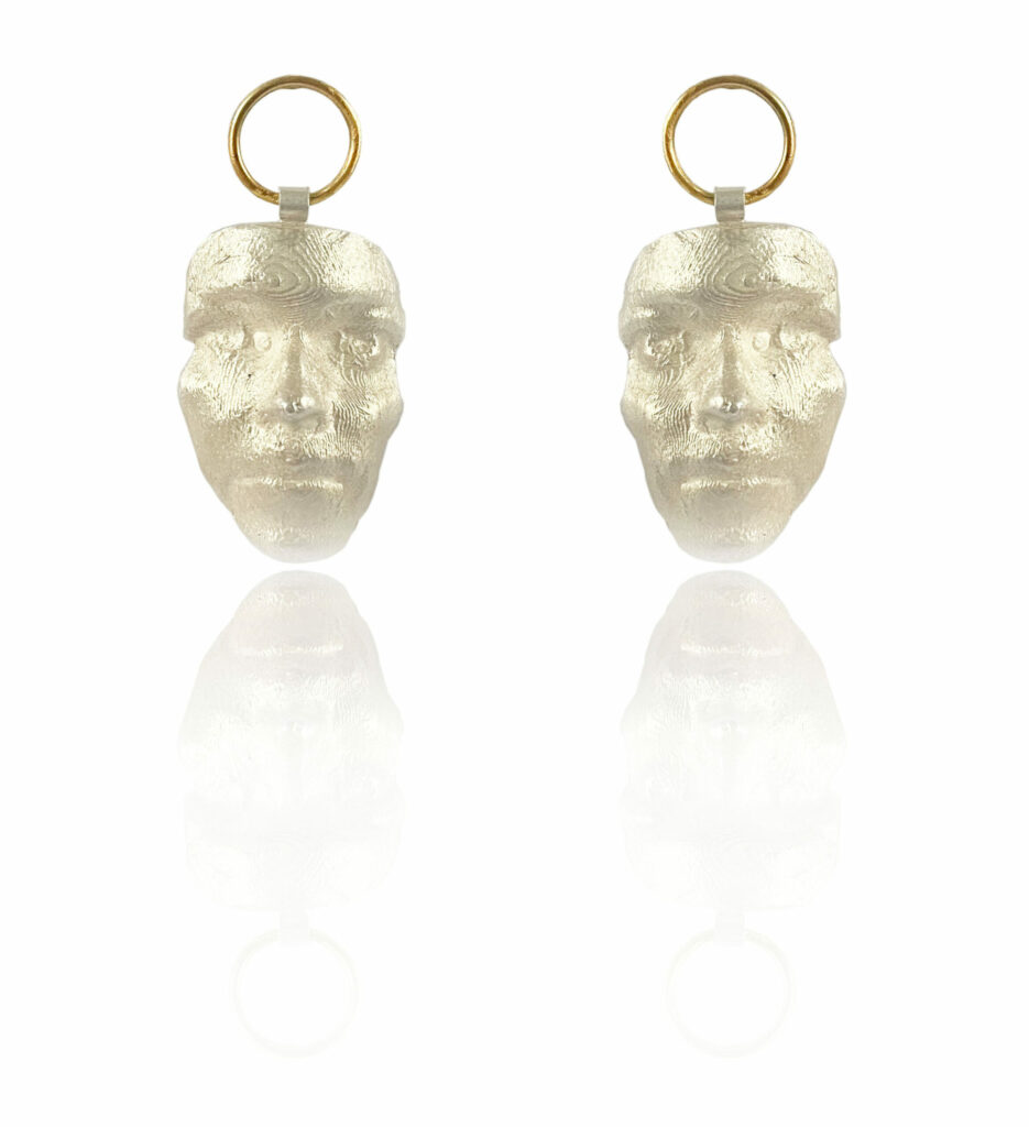 White and yellow precious metal earrings of AI generated face, can be hallmarked, 40x20mm