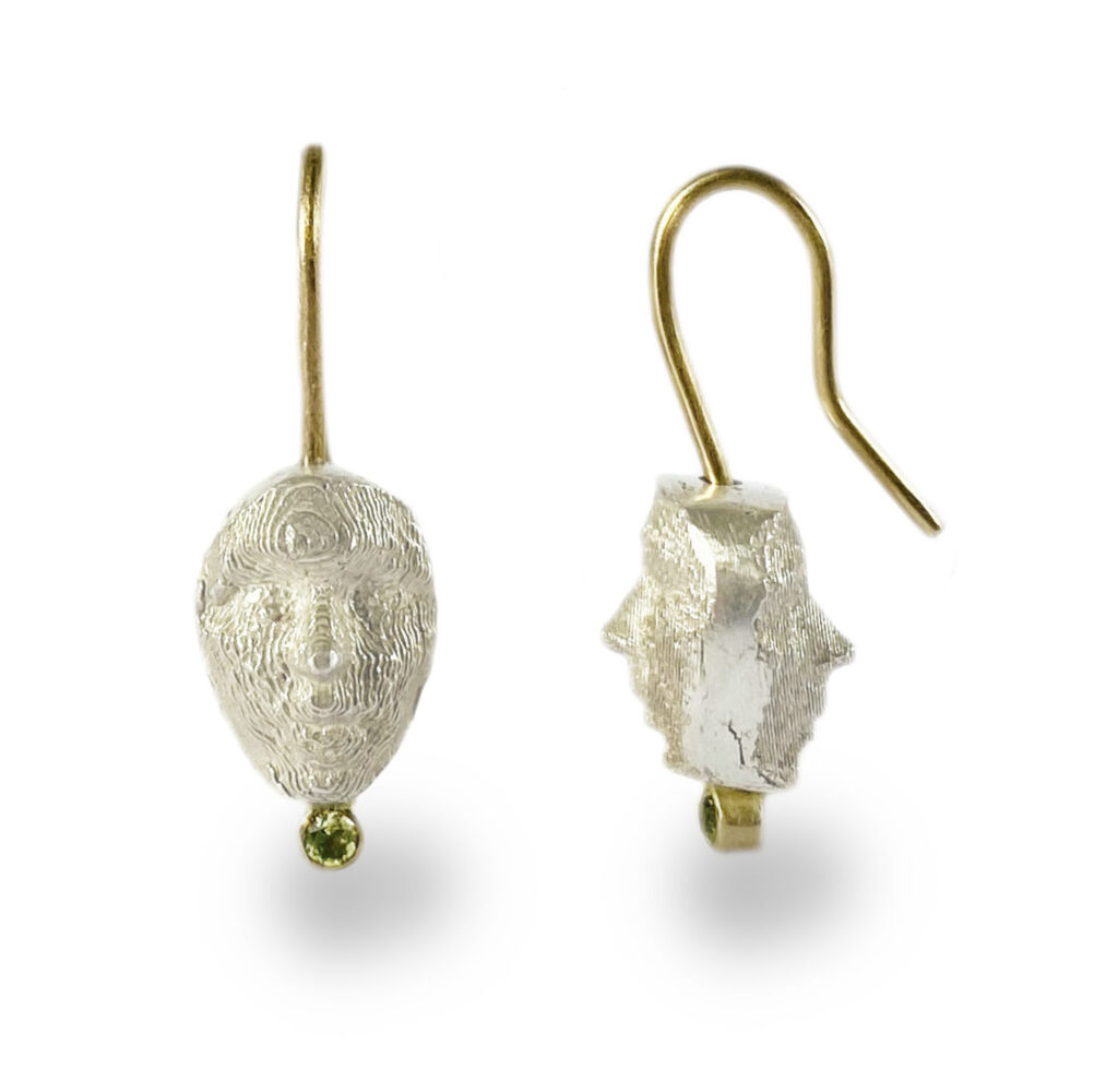White and yellow precious metal earrings of AI generated face, with peridot stone setting can be hallmarked, 30x10mm