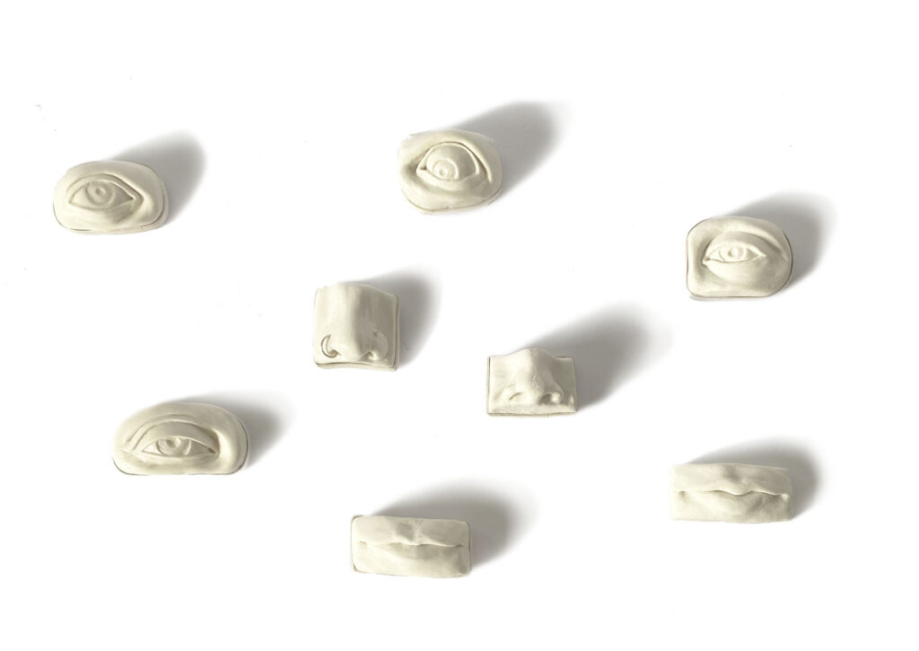 White precious metal hoop earrings of repeated 3D scanned and printed noses, can be hallmarked, 30x25mm