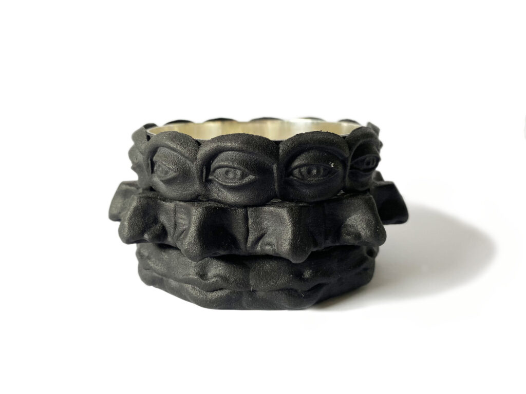 Triptych of 3D printed nylon and precious white metal bangles, can be hallmarked, inside circumference 220mm, width 16mm