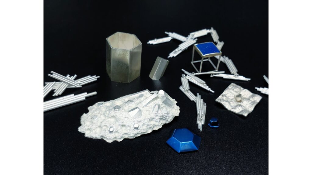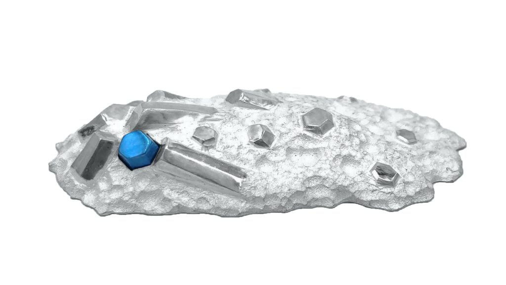 This design is a combination of my finished pieces and samples and will be made in silver, featuring blue niobium crystal facets. It incorporates the two different styles of crystal growth into one: needle-shaped crystals and larger faceted crystals.