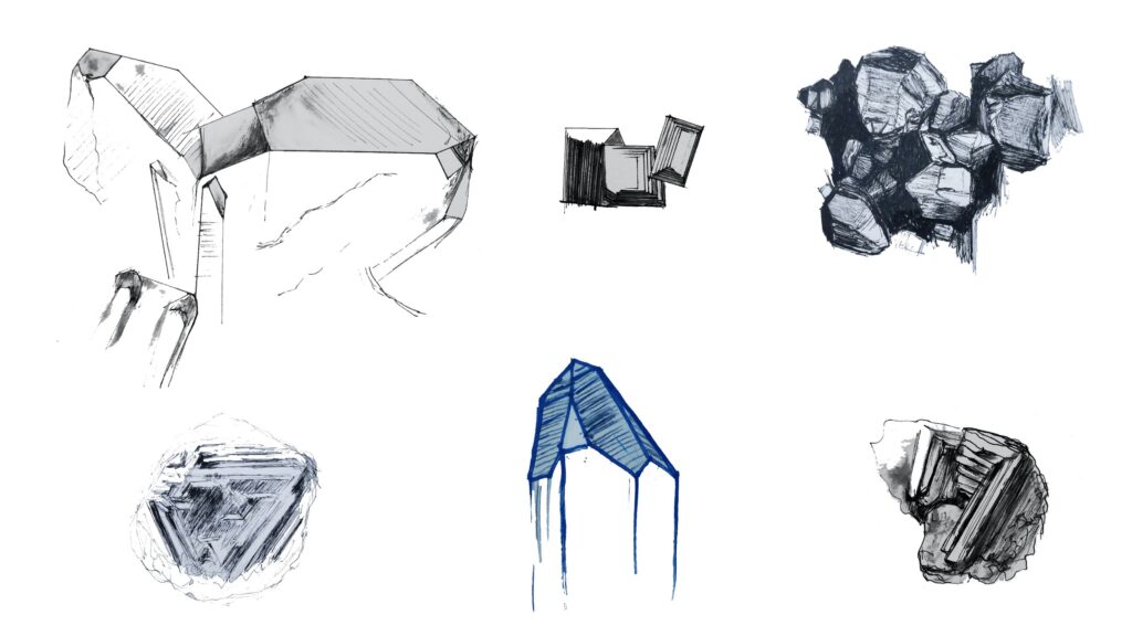 This is a page from my sketchbook, showing drawings of the different types of crystal shapes from primary and secondary research. From left to right: (1st row) quartz, pyrite, copper, (2nd row) diamond, quartz, halite.