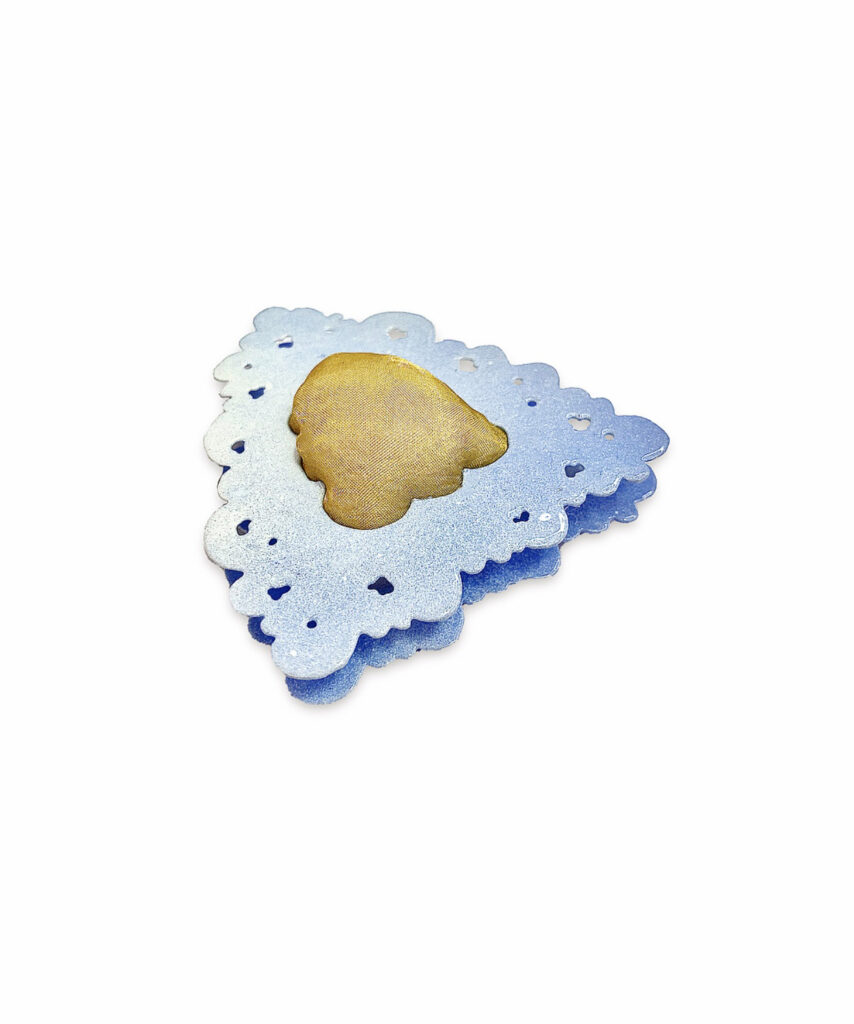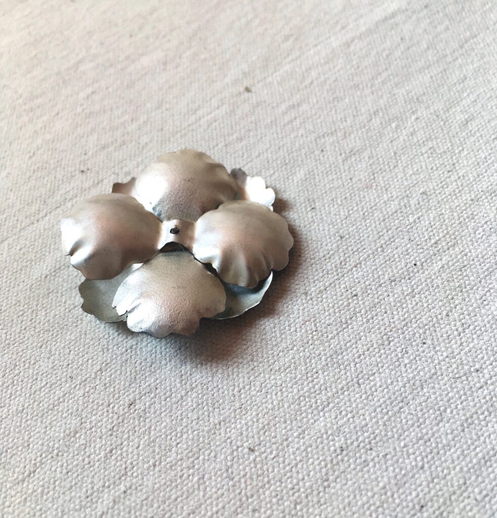 This silver and niobium brooch is inspired by the hexagonal prism crystal forms in the gemstone emerald (a variety of the mineral beryl). This brooch is hand-fabricated using the ancient technique of chasing and repousse. The blue hexagon is made from a unusual metal- niobium- and has been anodised to blue to create a pop of colour.