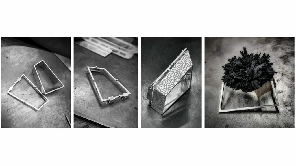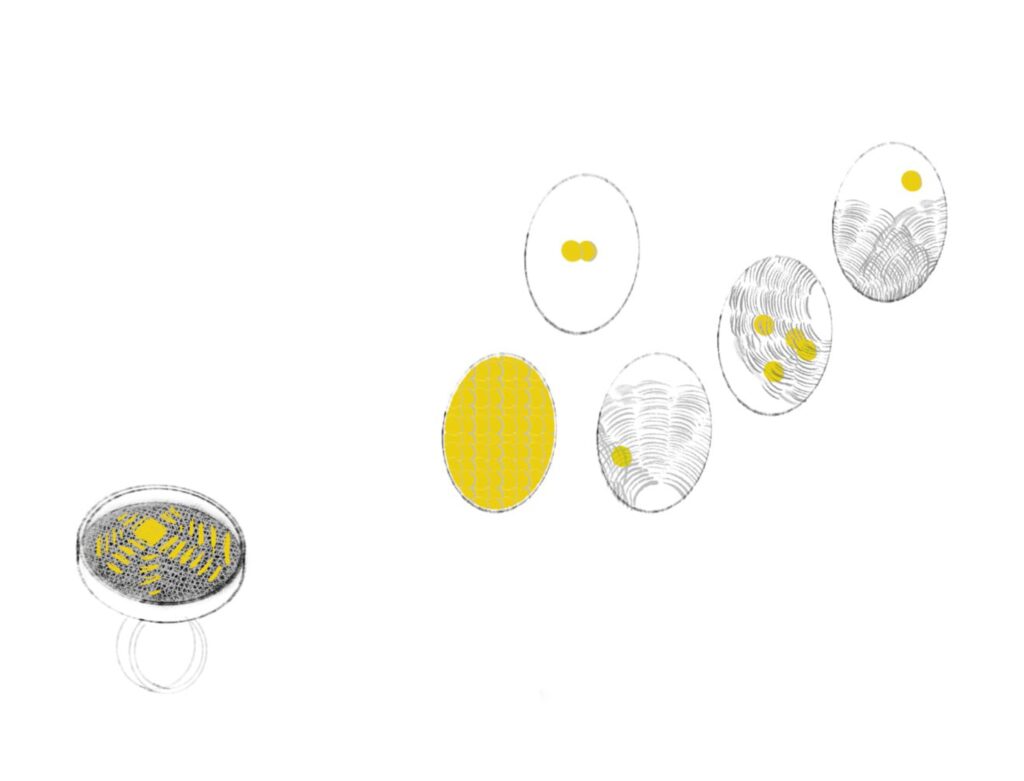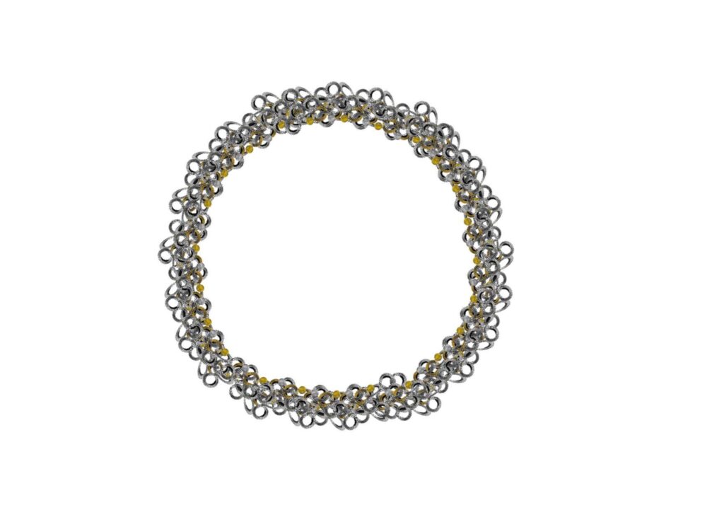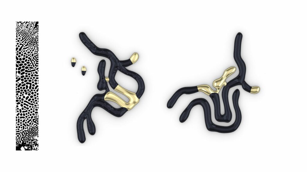 Ferrofluid Inspired Bracelet Design. Black Rhodium Silver + 18ct Yellow Gold Cast Link Bracelet. Selection of 3D CAD presentation work and 3D modelling, 3D printed cast silver components. Entry received the Precious Metal Bursary Award from The Goldsmiths Centre & Cookson gold.