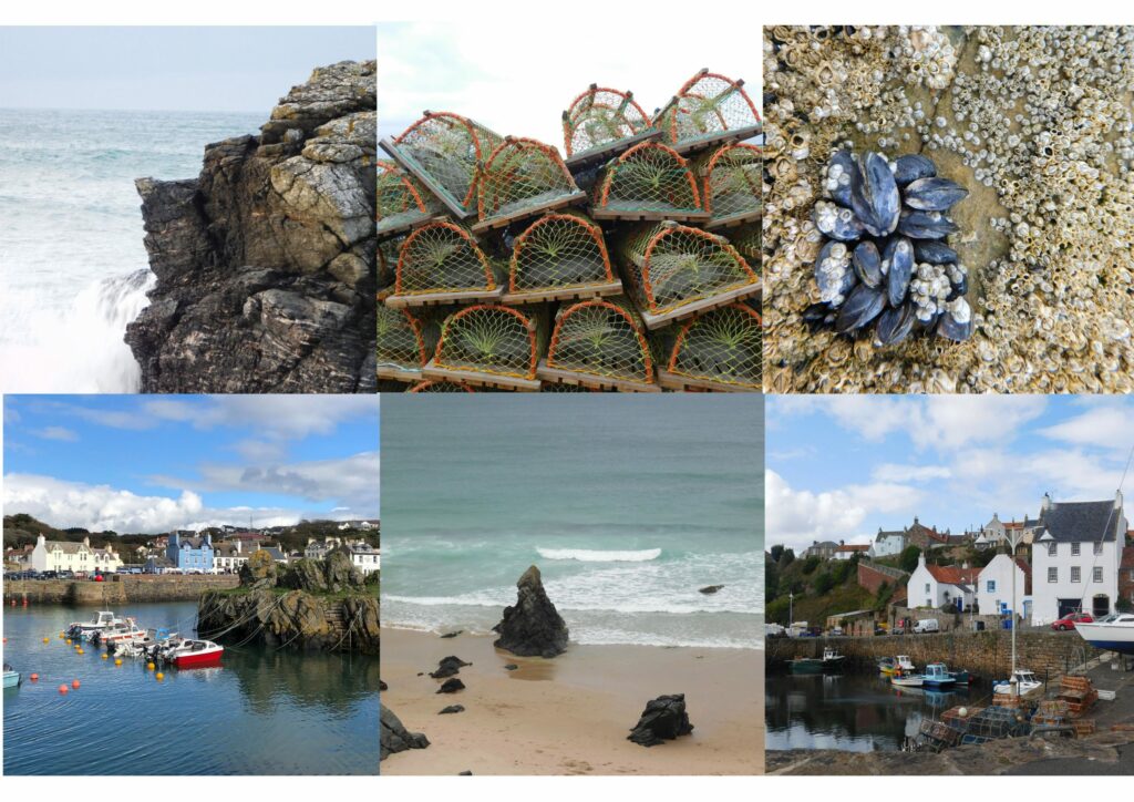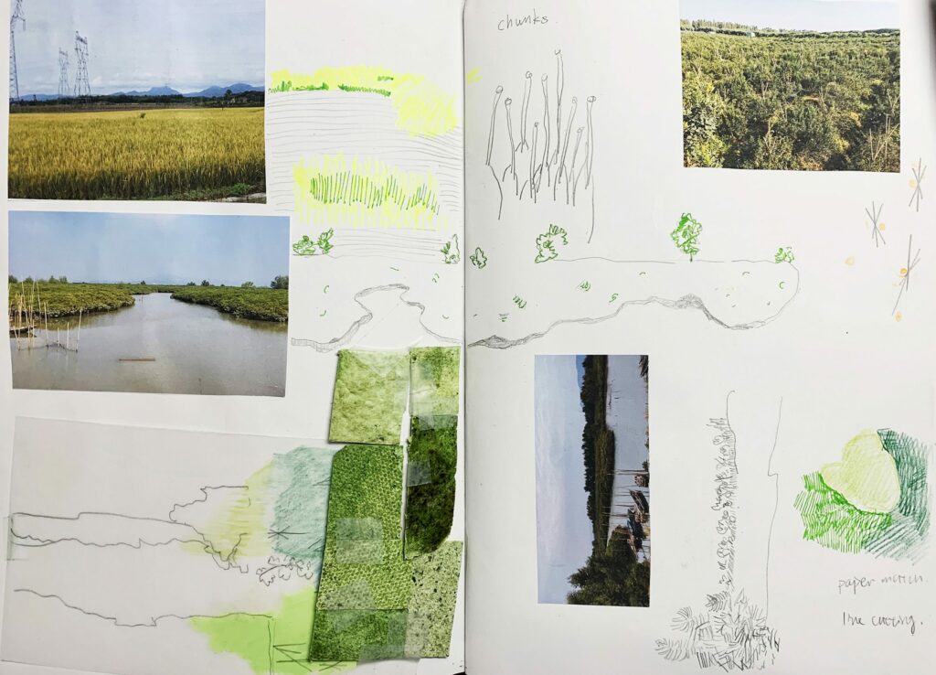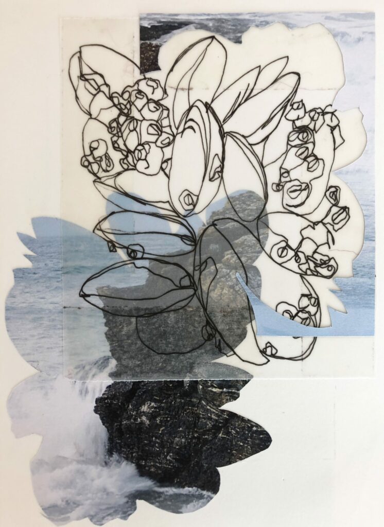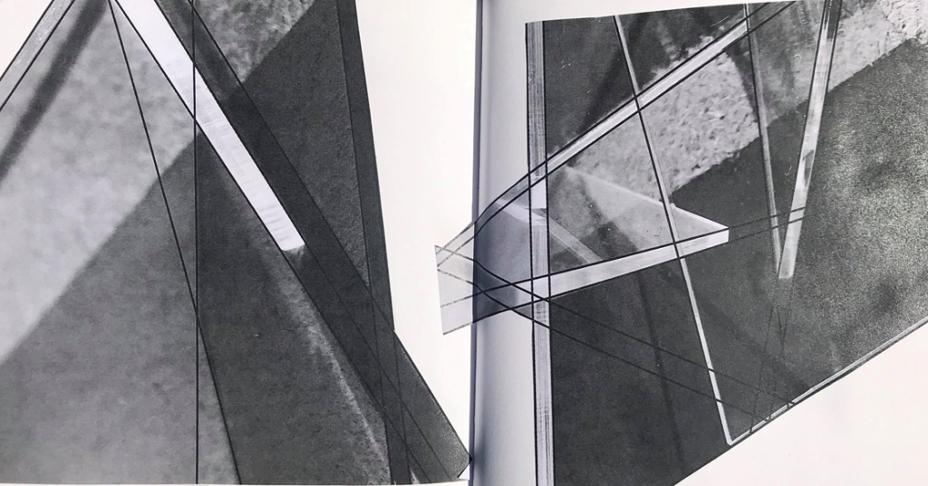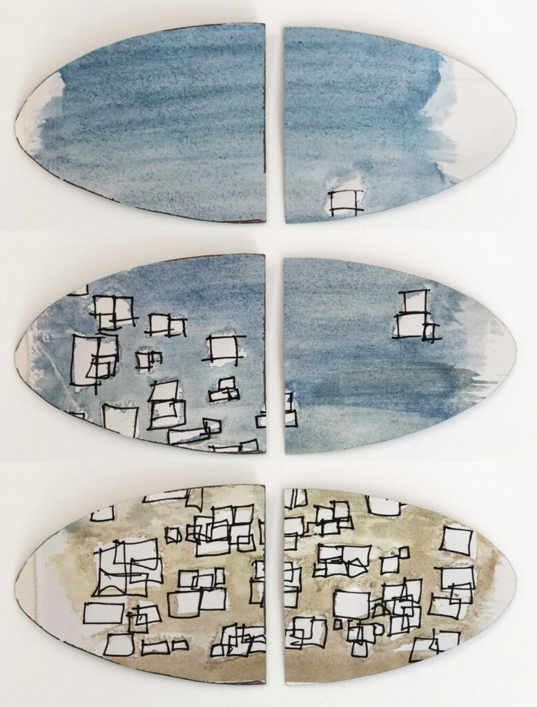 Blue John Stone is a variety of fluorite found in Derbyshire, UK. As part of my research, I visited the Treak Cliff Cavern, where Blue John Stone can be found in situé. This collage from my sketchbook shows how I started to build up shapes into my work, by painting out block shapes on top of my photographs.