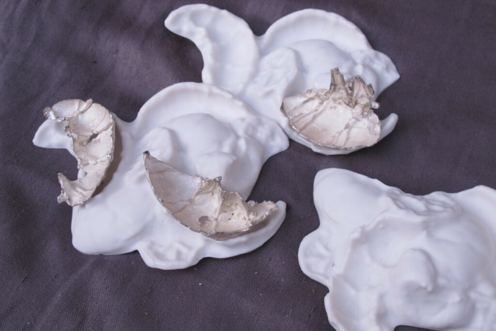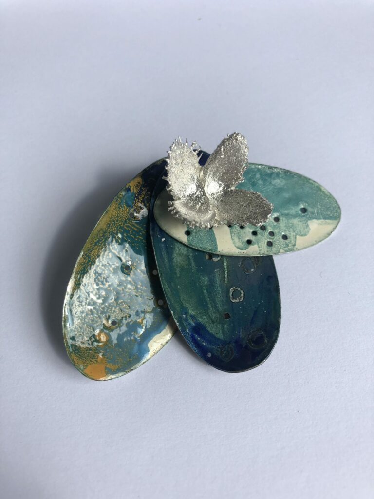 Porcelain and precious white metal brooches, dimensions are different for each brooch, averages at 30x40mm