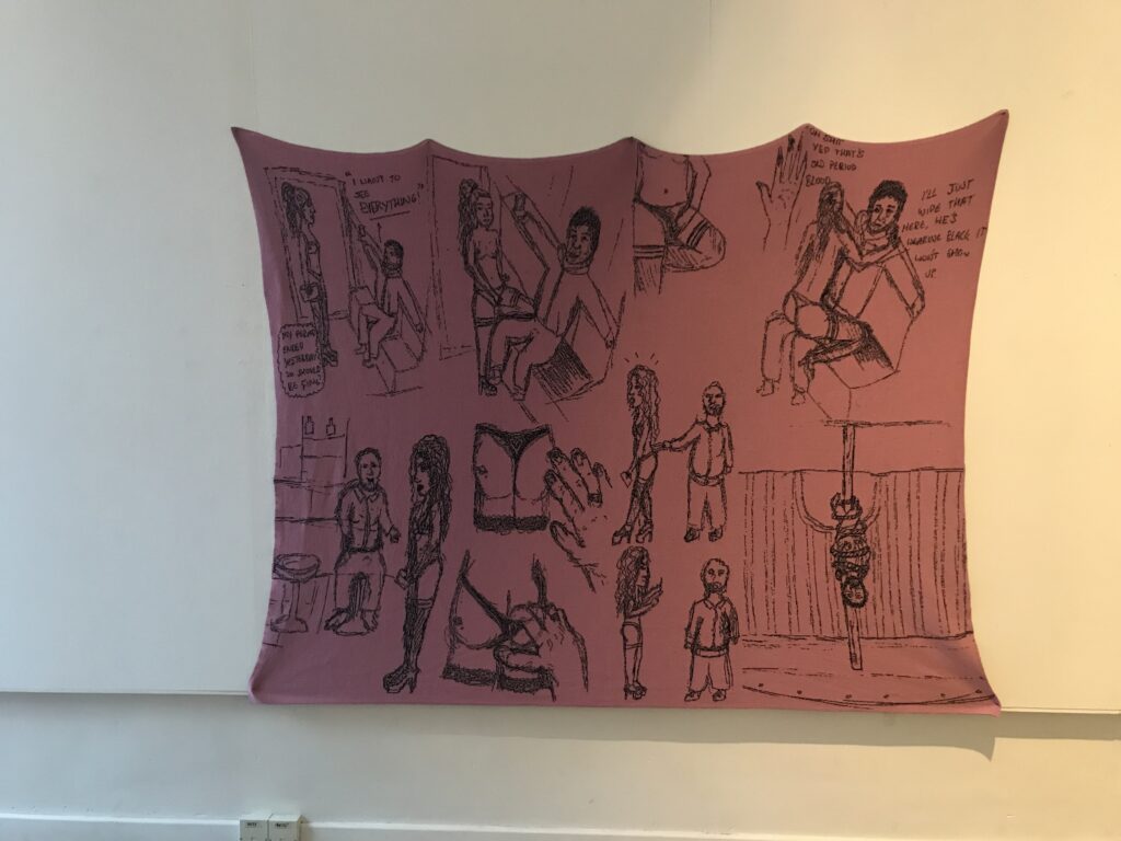 A knitted blanket with sketches of the artists stripper anecdotes and stories