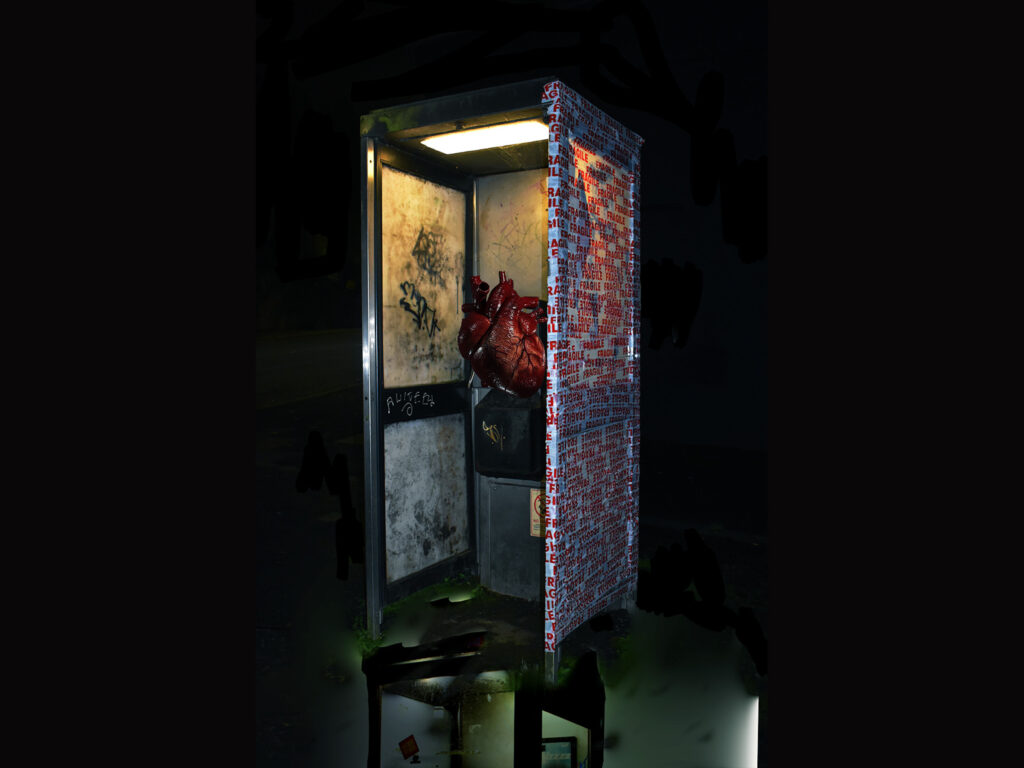 This work exhibited in 'Cry and Laugh' in Glasgow Websters Theatre (former Lansdowne Parish Church) on 25th January 2020. Being in and out of relationships since I was 15, I adapted an emotional reliance on a partner to give me what I was avoiding to create for my self. The dimensions of this are of a telephone box; an abandoned communication portal I continuously salute as they represent the fragility and vulnerability of life. The titles of my work always act as a joke with a jab kinda coping mechanism.