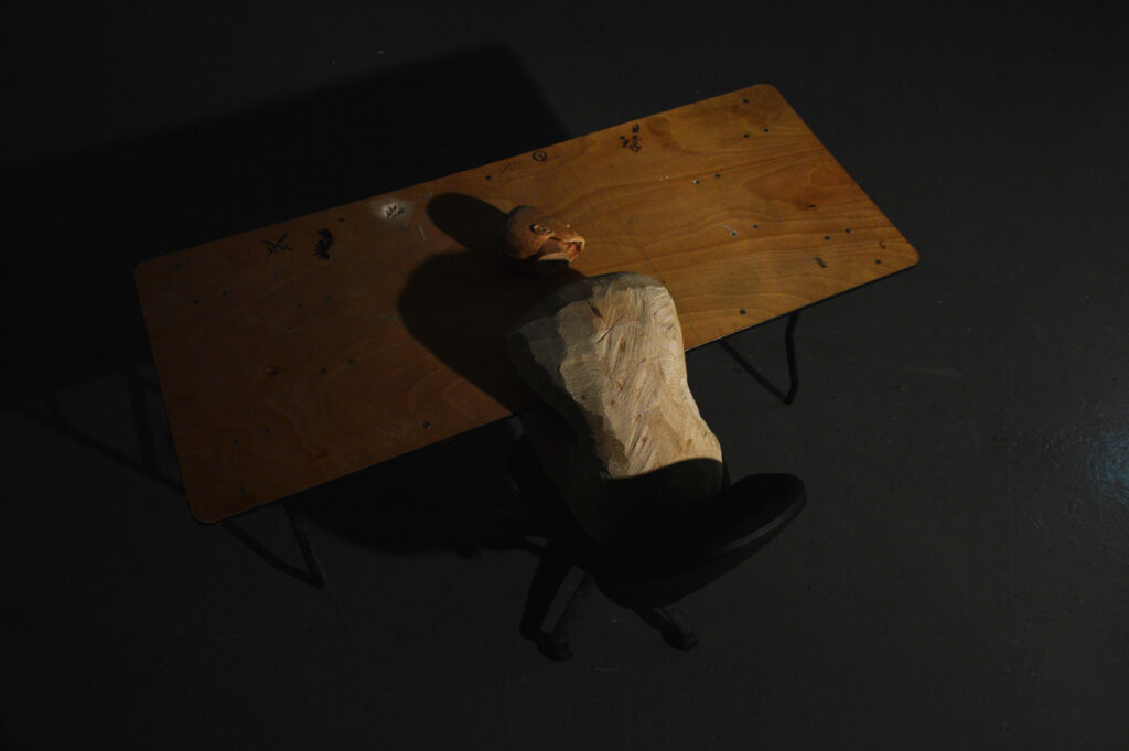[Carved industrial pine, office chair and table.] GSA Y4 group exhibition, ‘It’s a Mess’.