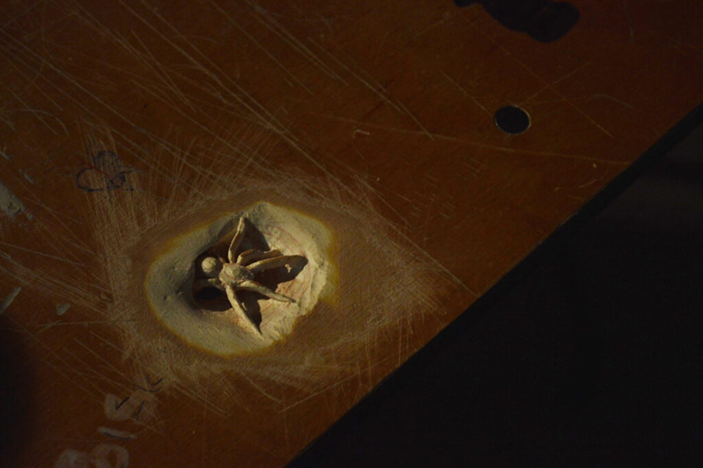 Spider infested head carved during lockdown in response to COVID-19. [scrap industrial pine].