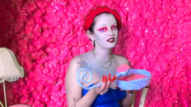 A performance of the artist wearing a fishnet bodysuit with embroidery thread rug tufted through the breast and crotch. throughout the performance the artist dances around a makeshift pole and trims the embroidery thread attached to the bodysuit.