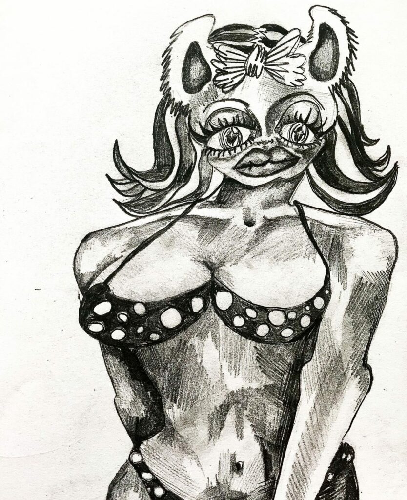 A page from one of the strip comic zines that depict short stories of experiences as a stripper through quick sketches and speech bubbles